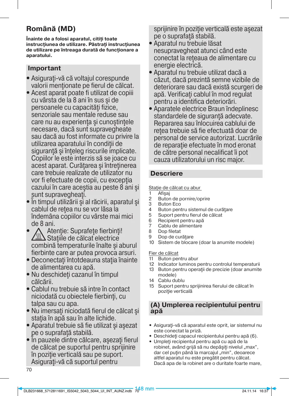 sprijinire în poziţie verticală este aşezat pe o suprafaţă stabilă. Aparatul nu trebuie lăsat nesupravegheat atunci când este conectat la reţeaua de alimentare cu energie electrică. Aparatul nu trebuie utilizat dacă a căzut, dacă prezintă semne vizibile de deteriorare sau dacă există scurgeri de apă. Verificaţi cablul în mod regulat pentru a identifica deteriorări. Aparatele electrice Braun îndeplinesc standardele de siguranţă adecvate. Repararea sau înlocuirea cablului de reţea trebuie să fie efectuată doar de personal de service autorizat. Lucrările de reparaţie efectuate în mod eronat de către personal necalificat îi pot cauza utilizatorului un risc major. Descriere Staţie de călcat cu abur 1 Afişaj 2 Buton de pornire/oprire 3 Buton Eco 4 Buton pentru sistemul de curăţare 5 Suport pentru fierul de călcat 6 Recipient pentru apă 7 Cablu de alimentare 8 Dop filetat 9 Dop de curăţare 10 Sistem de blocare (doar la anumite modele) Fier de călcat 11 Buton pentru abur 12 Indicator luminos pentru controlul temperaturii 13 Buton pentru operaţii de precizie (doar anumite modele) 14 Cablu dublu 15 Suport pentru sprijinirea fierului de călcat în poziţie verticală