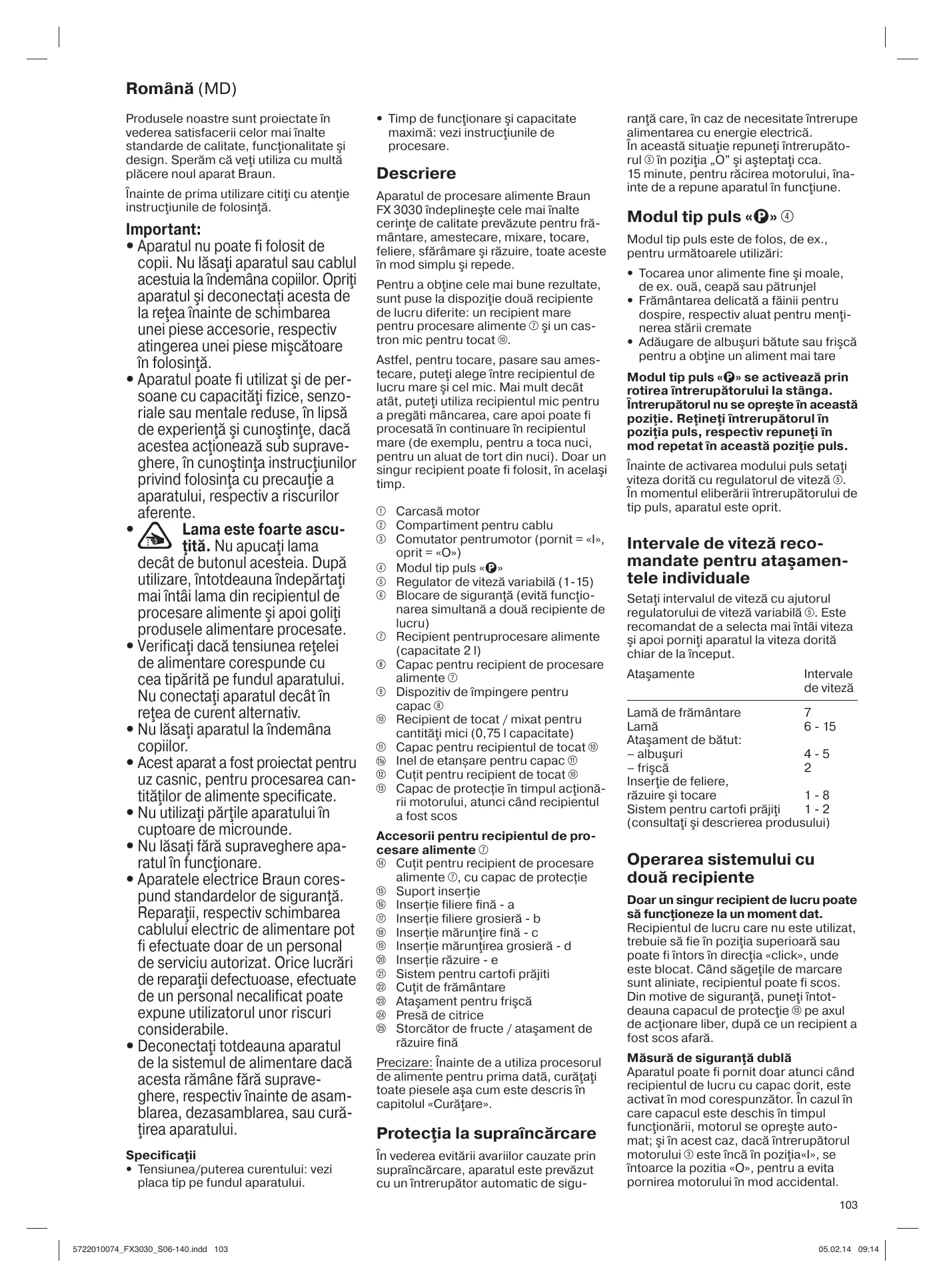 - Timp de funcţionare şi capacitate maximă: vezi instrucţiunile de procesare. Înainte de prima utilizare citiţi cu atenţie instrucţiunile de folosinţă. Aparatul de procesare alimente Braun FX 3030 îndeplineşte cele mai înalte cerinţe de calitate prevăzute pentru frământare, amestecare, mixare, tocare, feliere, sfărâmare şi răzuire, toate aceste în mod simplu şi repede. Important: