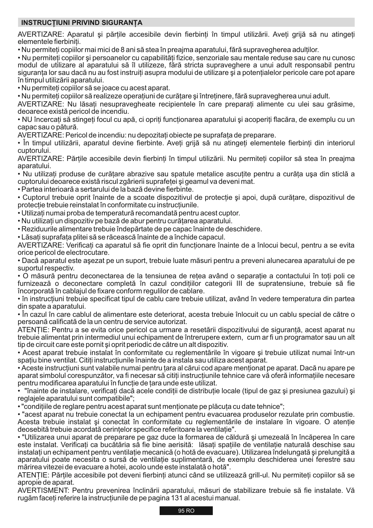 - "Utilizarea unui aparat de preparare pe gaz duce la formarea de căldură şi umezeală în încăperea în care este instalat. Verificaţi ca bucătăria să fie bine aerisită: lăsaţi spaţiile de ventilaţie naturală deschise sau instalaţi un echipament pentru ventilaţie mecanică (o hotă de evacuare). Utilizarea îndelungată şi prelungită a aparatului poate necesita o sursă de ventilaţie suplimentară, de exemplu deschiderea unei ferestre sau mărirea vitezei de evacuare a hotei, acolo unde este instalată o hotă". ATENŢIE: Părţile accesibile pot deveni fierbinţi atunci când se utilizează grill-ul. Nu permiteţi copiilor să se apropie de aparat. AVERTISMENT: Pentru prevenirea înclinării aparatului, măsuri de stabilizare trebuie să fie instalate. Vă rugăm faceţi referire la instrucţiunile de pe pagina 131 al acestui manual. 95 RO