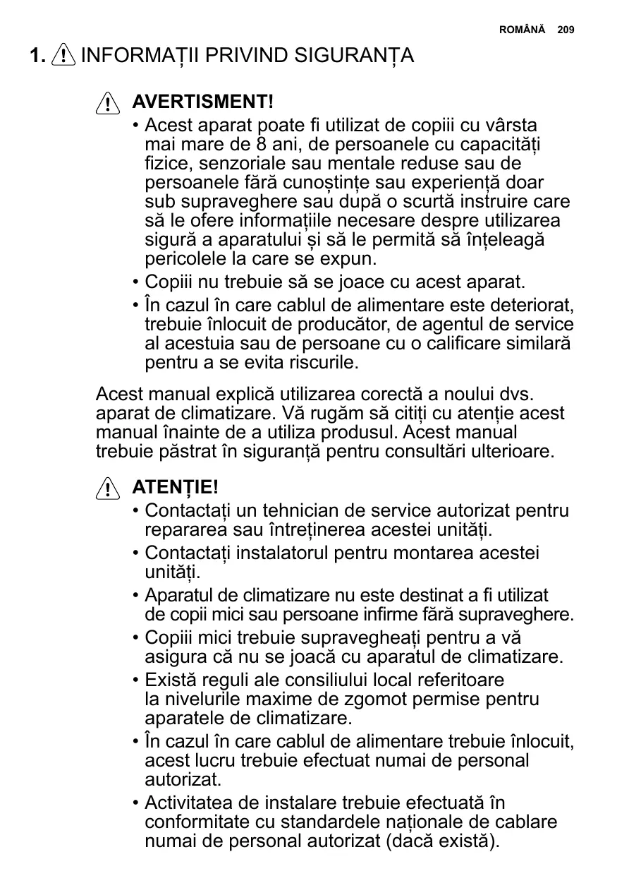 - Aparatul de climatizare nu este destinat a fi utilizat de copii mici sau persoane infirme fără supraveghere.