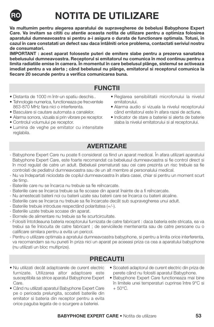 RO NOTITA DE UTILIZARE Va multumim pentru alegerea aparatului de supravegheree de bebelusi Babyphone Expert Care. Va invitam sa cititi cu atentie aceasta notita de utilizare pentru a optimiza folosirea aparatului dumneavoastra si pentru a-i asigura o durata de functionare optimala. Totusi, în cazul în care constatati un defect sau daca întâlniti orice problema, contactati seriviul nostru de consumatori. IMPORTANT : acest aparat foloseste puteri de emitere slabe pentru a prezerva sanatatea bebelusului dumneavoastra. Receptorul si emitatorul nu comunica în mod continuu pentru a limita radiatiile emise în camera. Ïn momentul în care bebelusul plânge, sistemul se activeaza imediat pentru a va alerta ; când bebelusul nu plânge, emitatorul si receptorul comunica la fiecare 20 secunde pentru a verifica comunicarea buna.