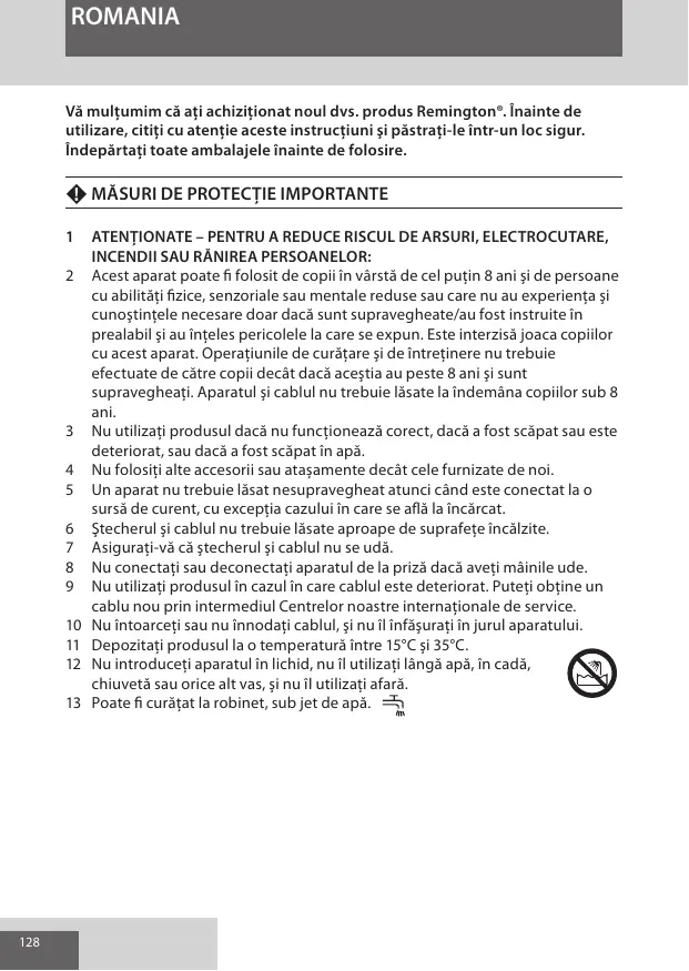 ROMANIA Vă mulţumim că aţi achiziţionat noul dvs. produs Remington®. Înainte de utilizare, citiţi cu atenţie aceste instrucţiuni şi păstraţi-le într-un loc sigur. Îndepărtaţi toate ambalajele înainte de folosire. F MĂSURI DE PROTECŢIE IMPORTANTE