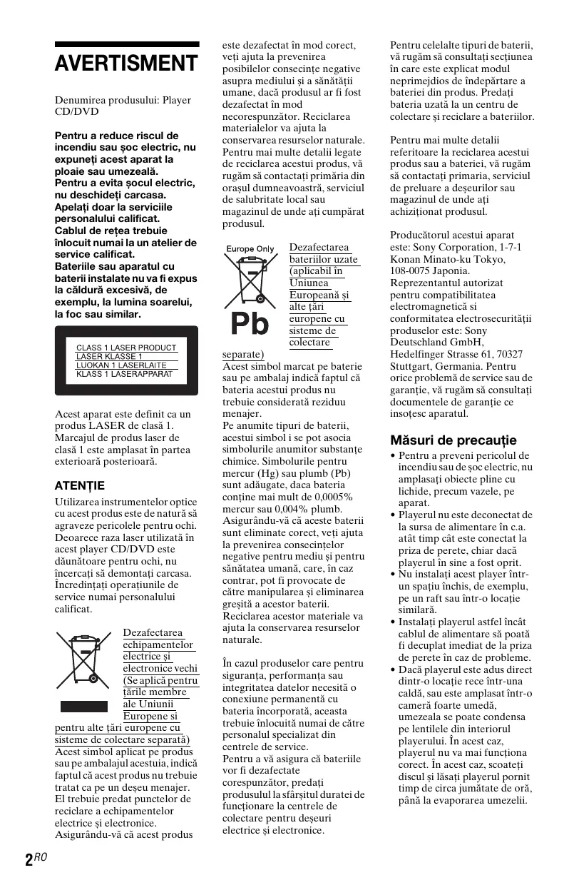 Pentru celelalte tipuri de baterii, vă rugăm să consultaţi secţiunea în care este explicat modul neprimejdios de îndepărtare a bateriei din produs. Predaţi bateria uzată la un centru de colectare și reciclare a bateriilor. Pentru mai multe detalii referitoare la reciclarea acestui produs sau a bateriei, vă rugăm să contactaţi primaria, serviciul de preluare a deșeurilor sau magazinul de unde aţi achiziţionat produsul. Producătorul acestui aparat este: Sony Corporation, 1-7-1 Konan Minato-ku Tokyo, 108-0075 Japonia. Reprezentantul autorizat pentru compatibilitatea electromagnetică si conformitatea electrosecurităţii produselor este: Sony Deutschland GmbH, Hedelfinger Strasse 61, 70327 Stuttgart, Germania. Pentru orice problemă de service sau de garanţie, vă rugăm să consultaţi documentele de garanţie ce insoţesc aparatul.