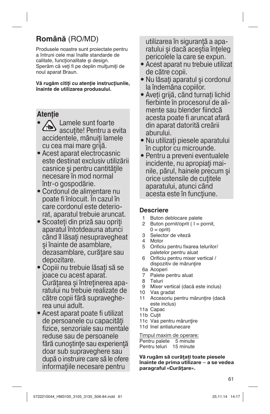 Română (RO/MD) Produsele noastre sunt proiectate pentru a întruni cele mai înalte standarde de calitate, funcţionalitate şi design. Sperăm că veţi fi pe deplin mulţumiţi de noul aparat Braun. Vă rugăm citiţi cu atenţie instrucţiunile, înainte de utilizarea produsului.