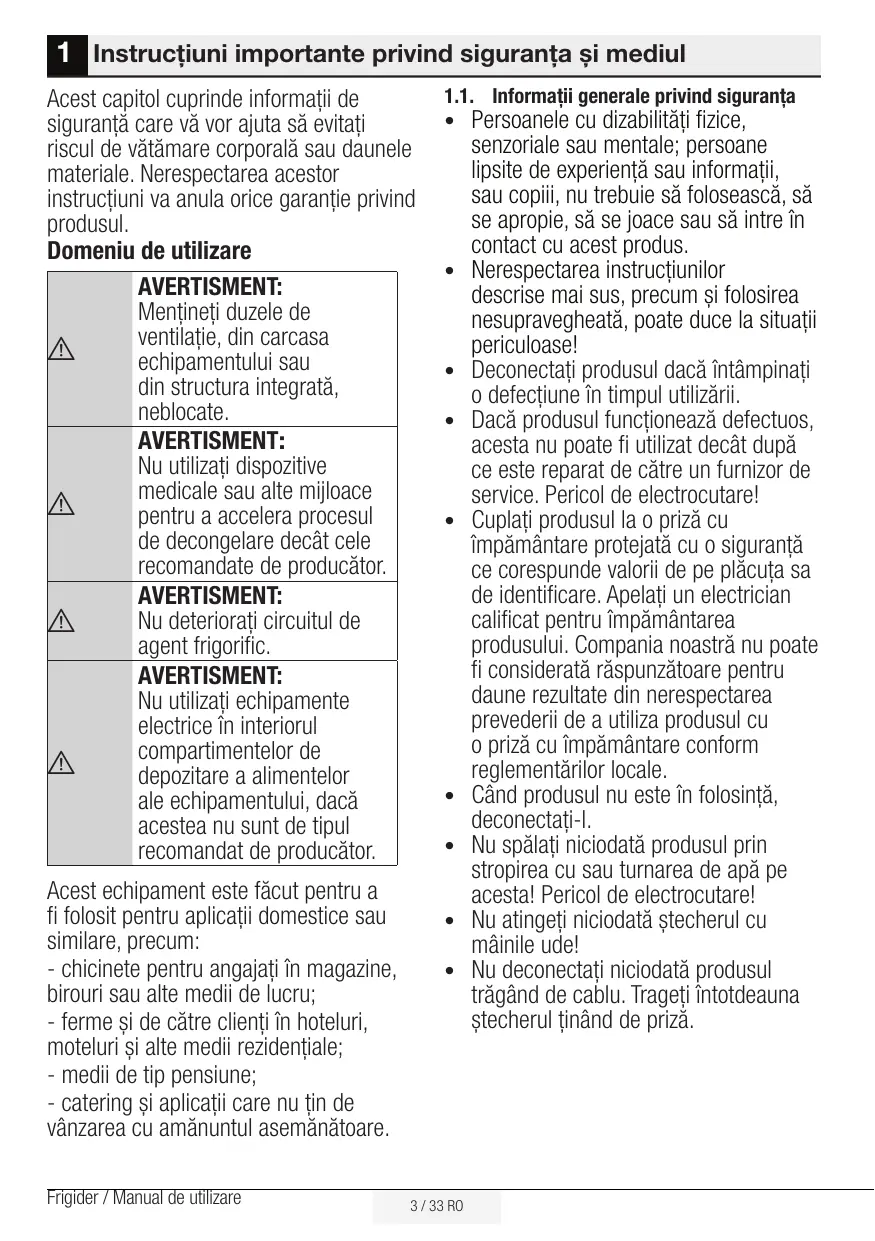 Frigider / Manual de utilizare 1 Instrucțiuni importante privind siguranța și mediul Acest capitol cuprinde informații de siguranță care vă vor ajuta să evitați riscul de vătămare corporală sau daunele materiale. Nerespectarea acestor instrucțiuni va anula orice garanție privind produsul. Domeniu de utilizare AVERTISMENT: Menţineţi duzele de ventilaţie, din carcasa echipamentului sau din structura integrată, neblocate. AVERTISMENT: Nu utilizaţi dispozitive medicale sau alte mijloace pentru a accelera procesul de decongelare decât cele recomandate de producător. AVERTISMENT: Nu deterioraţi circuitul de agent frigorific. AVERTISMENT: Nu utilizaţi echipamente electrice în interiorul compartimentelor de depozitare a alimentelor ale echipamentului, dacă acestea nu sunt de tipul recomandat de producător. Acest echipament este făcut pentru a fi folosit pentru aplicaţii domestice sau similare, precum: - chicinete pentru angajaţi în magazine, birouri sau alte medii de lucru; - ferme și de către clienţi în hoteluri, moteluri şi alte medii rezidenţiale; - medii de tip pensiune; - catering și aplicații care nu țin de vânzarea cu amănuntul asemănătoare. Frigider / Manual de utilizare 1.1. Informații generale privind siguranța