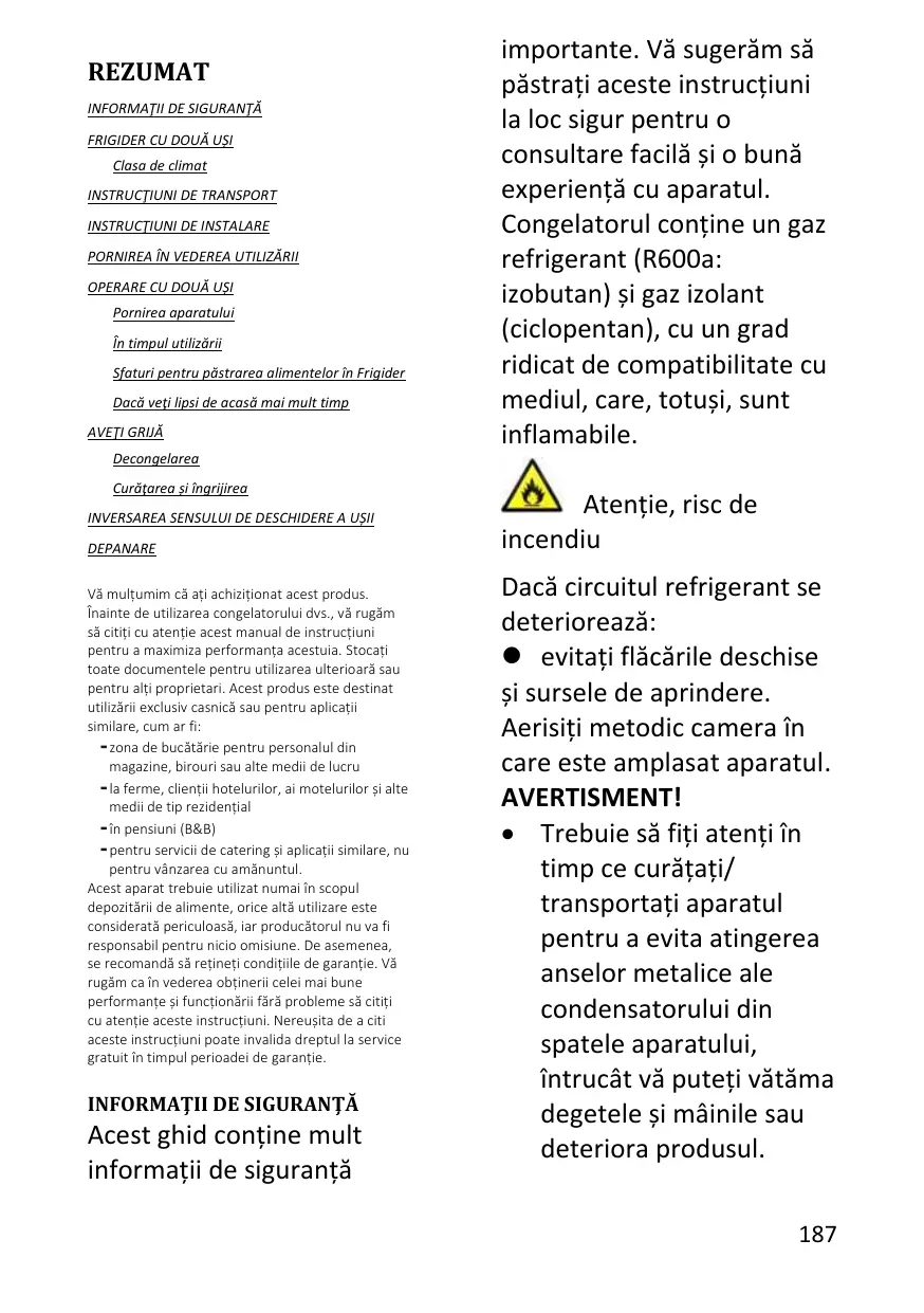 Astuces pour maintenir les aliments en parfait état dans le réfrigérateur Si vous vous absentez pendant une période prolongée ECONOMIE D’ÉNERGIE ENTRETIEN Dégivrage Nettoyage et entretien INVERSER L’OUVERTURE DE LA PORTE DÉPANNAGE Merci d’avoir acheté ce produit. Avant d’utiliser votre réfrigérateur, veuillez lire attentivement ce mode d’emploi afin d’optimiser sa performance. Conserver l’ensemble de la documentation pour un usage ultérieur ou pour d’autres propriétaires. Ce produit est conçu uniquement pour une utilisation ménagère ou des applications similaires comme : - coins-cuisine du personnel dans des magasins, bureaux et autres environnements de travail ; - dans les exploitations agricoles, pour la clientèle des hôtels, motels et autres environnements de type résidentiel - dans les hébergements Bed and Breakfast (B & B) - pour les services de restauration et des applications similaires non destinées à une vente au détail. Cet appareil doit être utilisé uniquement à des fins de conservation d’aliments, toute autre utilisation est considérée comme dangereuse et le fabricant ne sera pas responsable de toute omission. De plus, il est recommandé de prendre note des conditions de garantie. Pour obtenir la meilleure performance possible et un fonctionnement sans problème de votre appareil, il est très important de lire attentivement ces instructions. Tout nonrespect de ces instructions peut annuler votre droit à des services gratuits pendant la période de garantie.