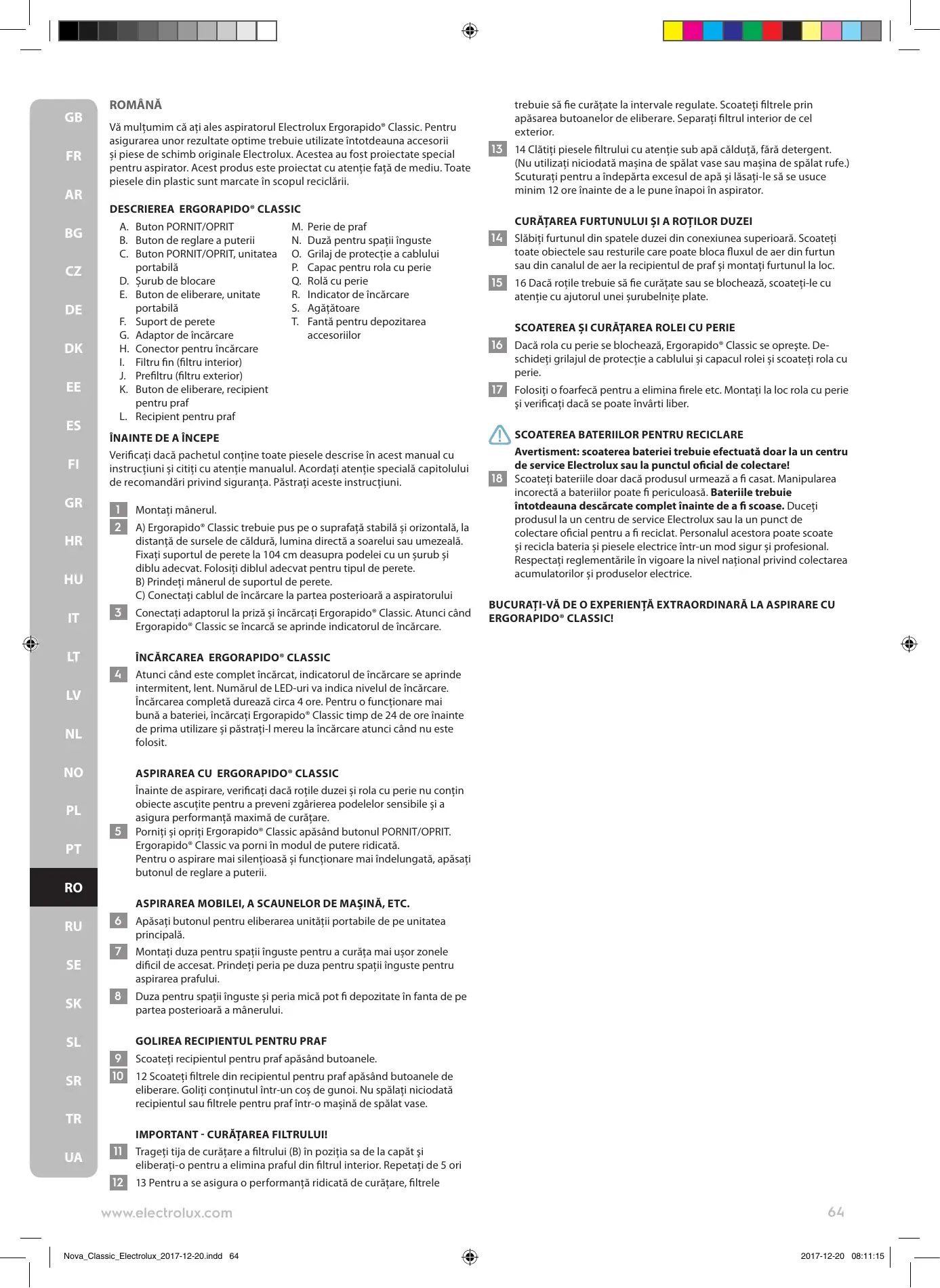GB FR AR BG CZ DE DK EE ES FI GR HR ROMÂNĂ Vă mulțumim că ați ales aspiratorul Electrolux Ergorapido® Classic. Pentru asigurarea unor rezultate optime trebuie utilizate întotdeauna accesorii și piese de schimb originale Electrolux. Acestea au fost proiectate special pentru aspirator. Acest produs este proiectat cu atenție față de mediu. Toate piesele din plastic sunt marcate în scopul reciclării.