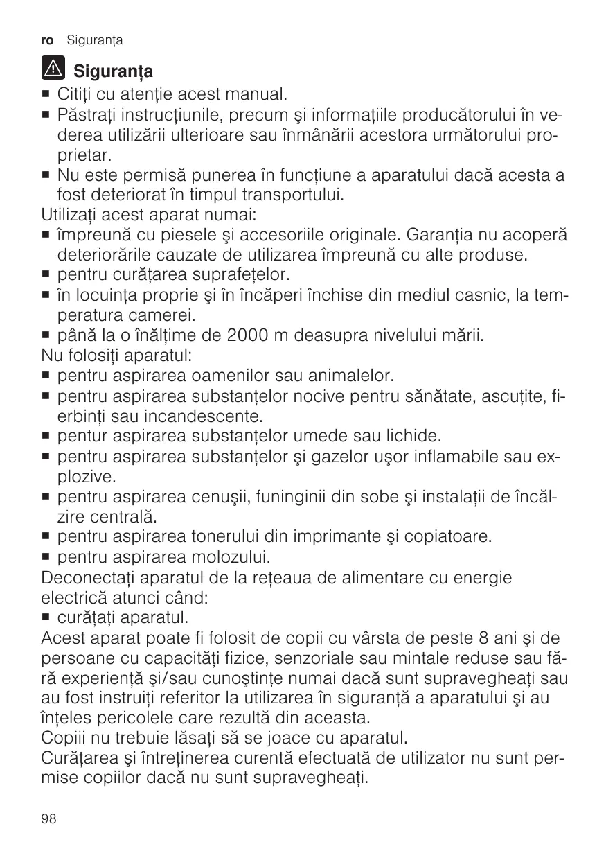 Siguranţa ¡ Citiţi cu atenţie acest manual. ¡ Păstraţi instrucţiunile, precum şi informaţiile producătorului în vederea utilizării ulterioare sau înmânării acestora următorului proprietar. ¡ Nu este permisă punerea în funcţiune a aparatului dacă acesta a fost deteriorat în timpul transportului. Utilizaţi acest aparat numai: ¡ împreună cu piesele şi accesoriile originale. Garanţia nu acoperă deteriorările cauzate de utilizarea împreună cu alte produse. ¡ pentru curăţarea suprafeţelor. ¡ în locuinţa proprie şi în încăperi închise din mediul casnic, la temperatura camerei. ¡ până la o înălţime de 2000 m deasupra nivelului mării. Nu folosiţi aparatul: ¡ pentru aspirarea oamenilor sau animalelor. ¡ pentru aspirarea substanţelor nocive pentru sănătate, ascuţite, fierbinţi sau incandescente. ¡ pentur aspirarea substanţelor umede sau lichide. ¡ pentru aspirarea substanţelor şi gazelor uşor inflamabile sau explozive. ¡ pentru aspirarea cenuşii, funinginii din sobe şi instalaţii de încălzire centrală. ¡ pentru aspirarea tonerului din imprimante şi copiatoare. ¡ pentru aspirarea molozului. Deconectaţi aparatul de la reţeaua de alimentare cu energie electrică atunci când: ¡ curăţaţi aparatul. Acest aparat poate fi folosit de copii cu vârsta de peste 8 ani şi de persoane cu capacităţi fizice, senzoriale sau mintale reduse sau fără experienţă şi/sau cunoştinţe numai dacă sunt supravegheaţi sau au fost instruiţi referitor la utilizarea în siguranţă a aparatului şi au înţeles pericolele care rezultă din aceasta. Copiii nu trebuie lăsaţi să se joace cu aparatul. Curăţarea şi întreţinerea curentă efectuată de utilizator nu sunt permise copiilor dacă nu sunt supravegheaţi. 98