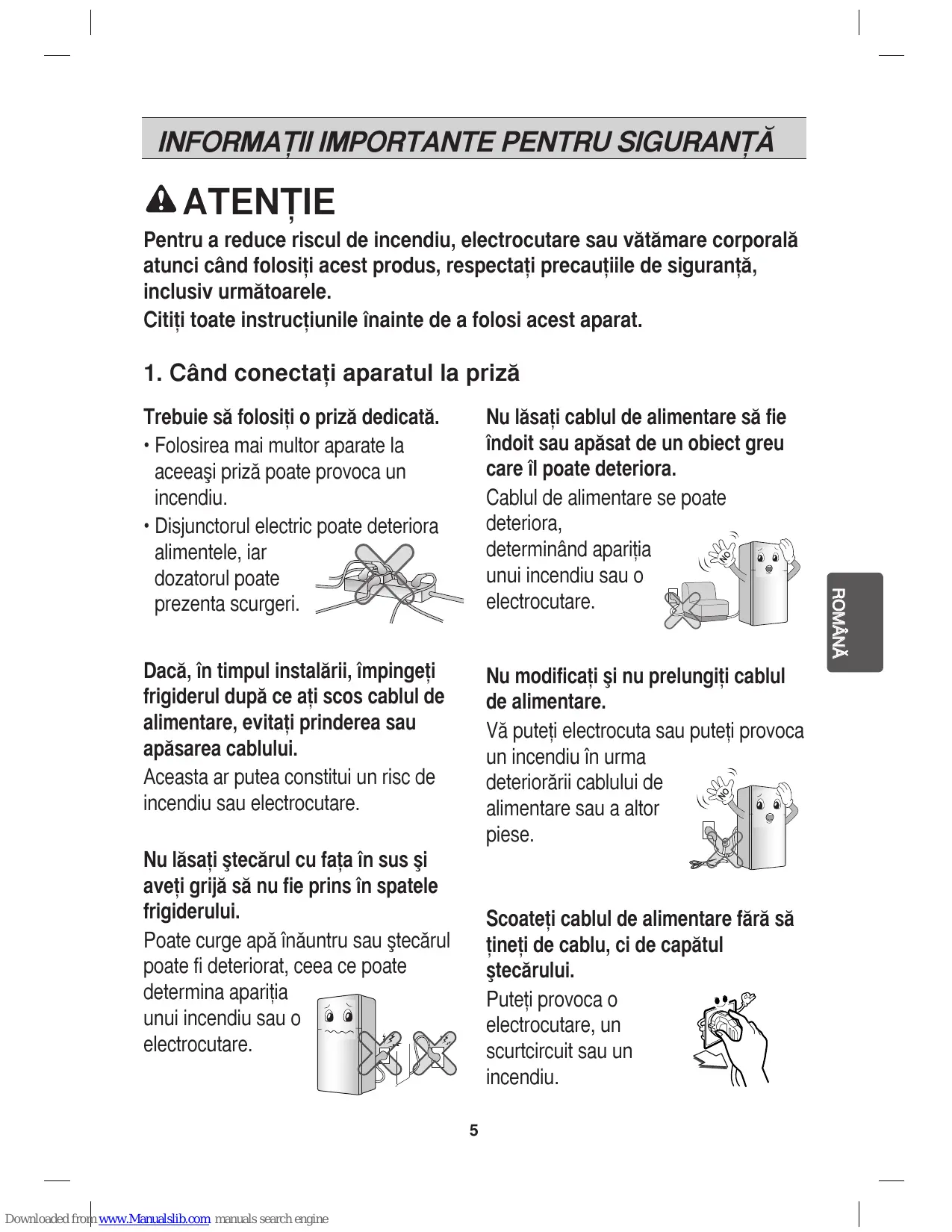 INFORMAˇII IMPORTANTE PENTRU SIGURANˇ® 1. C<nd conecta^i aparatul la priz™ •ndep™rta^i apa sau praful din ≥tec™r ≥i introduce^i-l, av<nd grij™ s™ fie bine fixate capetele. Praful, apa sau o conexiune nesigur™ pot provoca un incendiu sau o electrocutare.