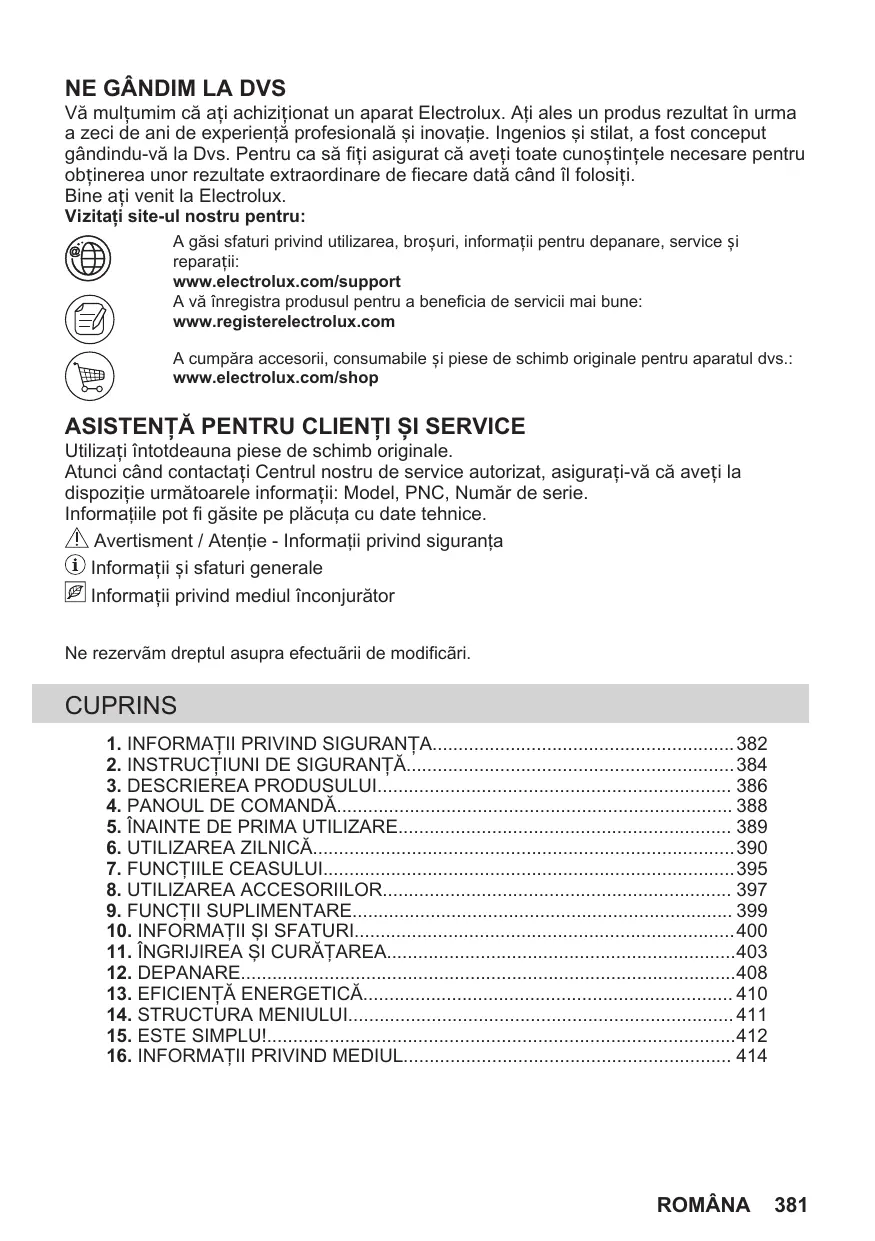 NE GÂNDIM LA DVS Vă mulțumim că ați achiziționat un aparat Electrolux. Aţi ales un produs rezultat în urma a zeci de ani de experienţă profesională şi inovaţie. Ingenios şi stilat, a fost conceput gândindu-vă la Dvs. Pentru ca să fiți asigurat că aveți toate cunoștințele necesare pentru obținerea unor rezultate extraordinare de fiecare dată când îl folosiți. Bine ați venit la Electrolux.