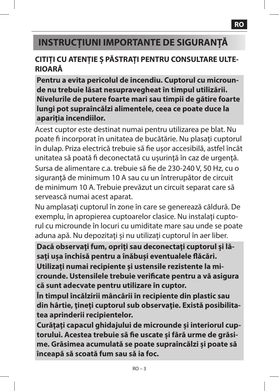 élément de cuisine. Veuillez ne pas placer le four dans un placard. La prise secteur doit être facilement accessible, afin que la fiche du cordon d’alimentation puisse être aisément débranchée en cas d’urgence. La tension d’alimentation doit être égale à 230-240 V, 50 Hz avec un fusible de distribution de 10 A minimum, ou un disjoncteur de 10 A minimum. La prise secteur doit être facilement accessible, afin que la fiche du cordon d’alimentation puisse être aisément débranchée en cas d’urgence. Veuillez ne pas placer votre four à proximité d’une zone génératrice de chaleur. Par exemple, près d’un four à cuisson conventionnelle. Ne placez pas ce four dans une atmosphère à humidité élevée ou bien où l’humidité peut s'accumuler. Ne stockez et n'utilisez pas le four à l’extérieur. Si vous observez la présence de fumée, éteignez ou débranchez le four et laissez la porte fermée afin d’étouffer les flammes. Utilisez uniquement des récipients et ustensiles compatibles avec la cuisson au micro-ondes. Il est important de vérifier que les ustensiles utilisés soient bien compatibles avec la cuisson au micro-ondes. Lorsque vous réchauffez un plat dans un récipient en plasFR – 3