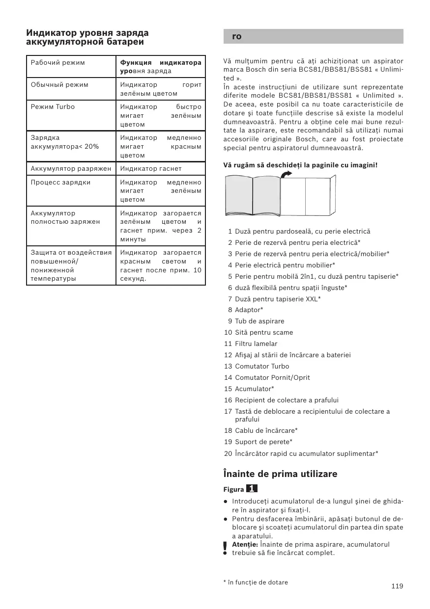 Vä multumim pentru cä ati achizitionat un aspirator marca Bosch din seria BCS81/BBS81/BSS81 « Unlimi- ted ». În aceste instructiuni de utilizare sunt reprezentate diferite modele BCS81/BBS81/BSS81 « Unlimited ». De aceea, este posibil ca nu toate caracteristicile de dotare si toate functiile descrise sä existe la modelul dumneavoasträ. Pentru a obtine cele mai bune rezul- tate la aspirare, este recomandabil sà utilizati numai accesorille originale Bosch, care au fost proiectate special pentru aspiratorul dumneavoasträ. Vä rugäm sà deschideti la pagi 1 Duzä pentru pardosealä, cu perie electricä 2 Perie de rezervä pentru peria electricä 8 Perie de rezervä pentru peria electricä/mobilier* 4 Perie electricä pentru mobilier* 5 Perie pentru mobilä 2in1, cu duzä pentru tapiserie* 6 duzä flexibilä pentru spati inguste* 7 Duzä pentru tapiserie XXL* 8 Adaptor* 9 Tub de aspirare 10 Sitä pentru scame 11 Filtru lamelar 12 Afisaj al stärii de incärcare a bateriei 13 Comutator Turbo 14 Comutator Pornit/Oprit 15 Acumulator* 16 Recipient de colectare a prafului 17 Tastä de deblocare a recipientului de colectare a prafului 18 Cablu de incärcare* 19 Suport de perete* 20 incärcätor rapid cu acumulator suplimentar* Înainte de prima utilizare Figura Introduceti acumulatorul de-a lungul sinei de ghida- re in aspirator si fixati-l. Pentru desfacerea imbinärii, apäsati butonul de de- blocare si scoateti acumulatorul din partea din spate à aparatului Atentie: inainte de prima aspirare, acumulatorul trebuie sà fie incärcat complet