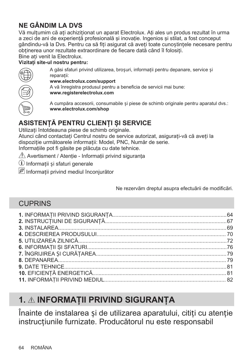 Vă mulțumim că ați achiziționat un aparat Electrolux. Aţi ales un produs rezultat în urma a zeci de ani de experienţă profesională şi inovaţie. Ingenios şi stilat, a fost conceput gândindu-vă la Dvs. Pentru ca să fiți asigurat că aveți toate cunoștințele necesare pentru obținerea unor rezultate extraordinare de fiecare dată când îl folosiți. Bine ați venit la Electrolux. Vizitați site-ul nostru pentru: A găsi sfaturi privind utilizarea, broșuri, informații pentru depanare, service și reparații: www.electrolux.com/support A vă înregistra produsul pentru a beneficia de servicii mai bune: www.registerelectrolux.com A cumpăra accesorii, consumabile și piese de schimb originale pentru aparatul dvs.: www.electrolux.com/shop