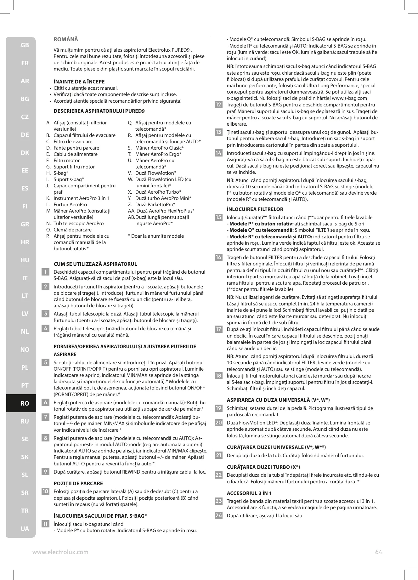 24 După utilizare, așezați-l la locul său. Accesoriul are 3 funcții, a se vedea imaginile de pe pagina următoare. Înlocuiți sacul s-bag atunci când - Modele P* cu buton rotativ: Indicatorul S-BAG se aprinde în roșu. www.electrolux.com