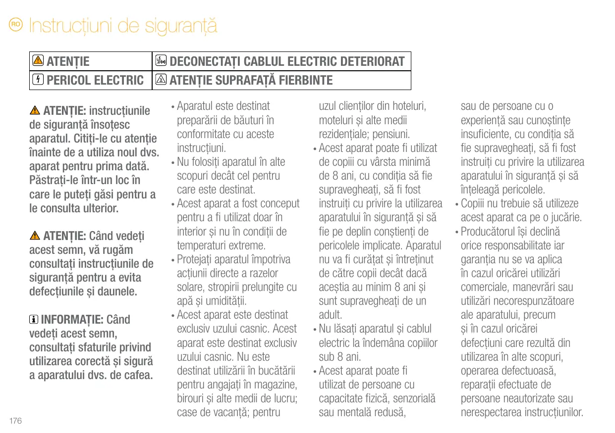 Instrucţiuni de siguranţă ATENŢIE PERICOL ELECTRIC ATENŢIE: instrucţiunile de siguranţă însoţesc aparatul. Citiţi-le cu atenţie înainte de a utiliza noul dvs. aparat pentru prima dată. Păstraţi-le într-un loc în care le puteţi găsi pentru a le consulta ulterior. ATENŢIE: Când vedeţi acest semn, vă rugăm consultaţi instrucţiunile de siguranţă pentru a evita defecţiunile şi daunele. INFORMAŢIE: Când vedeţi acest semn, consultaţi sfaturile privind utilizarea corectă şi sigură a aparatului dvs. de cafea.
