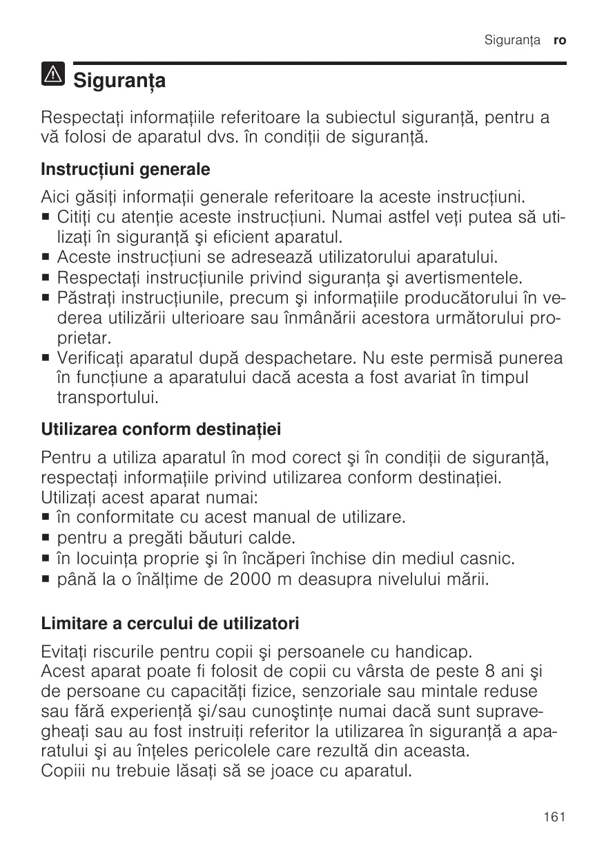 Siguranţa Respectaţi informaţiile referitoare la subiectul siguranţă, pentru a vă folosi de aparatul dvs. în condiţii de siguranţă. Instrucţiuni generale Aici găsiţi informaţii generale referitoare la aceste instrucţiuni. ¡ Citiţi cu atenţie aceste instrucţiuni. Numai astfel veţi putea să utilizaţi în siguranţă şi eficient aparatul. ¡ Aceste instrucţiuni se adresează utilizatorului aparatului. ¡ Respectaţi instrucţiunile privind siguranţa şi avertismentele. ¡ Păstraţi instrucţiunile, precum şi informaţiile producătorului în vederea utilizării ulterioare sau înmânării acestora următorului proprietar. ¡ Verificaţi aparatul după despachetare. Nu este permisă punerea în funcţiune a aparatului dacă acesta a fost avariat în timpul transportului. Utilizarea conform destinaţiei Pentru a utiliza aparatul în mod corect şi în condiţii de siguranţă, respectaţi informaţiile privind utilizarea conform destinaţiei. Utilizaţi acest aparat numai: ¡ în conformitate cu acest manual de utilizare. ¡ pentru a pregăti băuturi calde. ¡ în locuinţa proprie şi în încăperi închise din mediul casnic. ¡ până la o înălţime de 2000 m deasupra nivelului mării. Limitare a cercului de utilizatori Evitaţi riscurile pentru copii şi persoanele cu handicap. Acest aparat poate fi folosit de copii cu vârsta de peste 8 ani şi de persoane cu capacităţi fizice, senzoriale sau mintale reduse sau fără experienţă şi/sau cunoştinţe numai dacă sunt supravegheaţi sau au fost instruiţi referitor la utilizarea în siguranţă a aparatului şi au înţeles pericolele care rezultă din aceasta. Copiii nu trebuie lăsaţi să se joace cu aparatul. 161