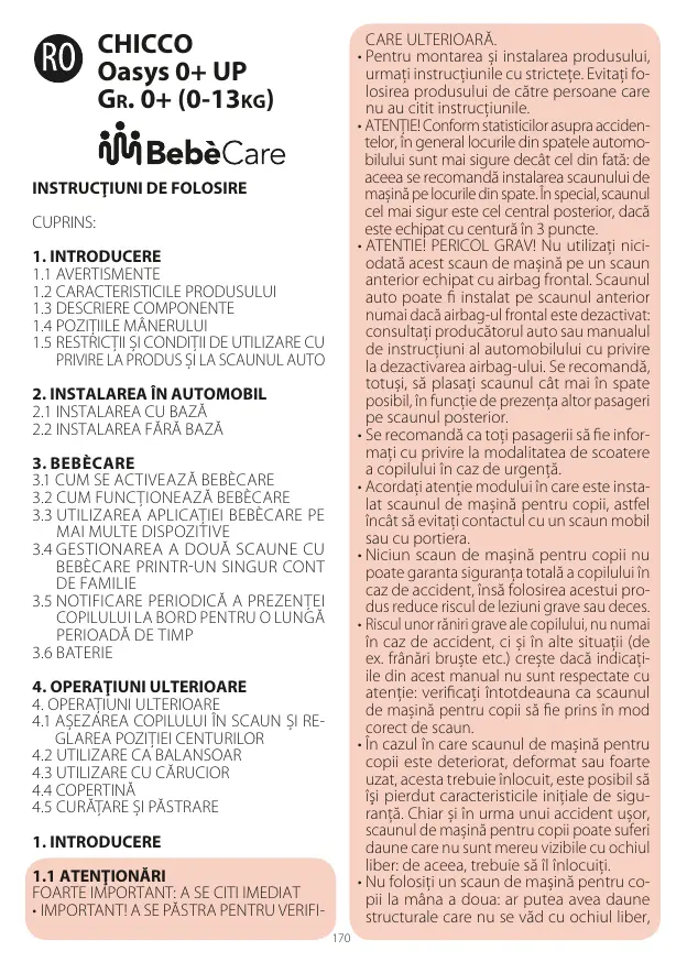 INSTRUCŢIUNI DE FOLOSIRE CUPRINS: 1. INTRODUCERE 1.1 AVERTISMENTE 1.2 CARACTERISTICILE PRODUSULUI 1.3 DESCRIERE COMPONENTE 1.4 POZIŢIILE MÂNERULUI 1.5 RESTRICŢII ȘI CONDIŢII DE UTILIZARE CU PRIVIRE LA PRODUS ȘI LA SCAUNUL AUTO 2. INSTALAREA ÎN AUTOMOBIL 2.1 INSTALAREA CU BAZĂ 2.2 INSTALAREA FĂRĂ BAZĂ 3. BEBÈCARE 3.1 CUM SE ACTIVEAZĂ BEBÈCARE 3.2 CUM FUNCŢIONEAZĂ BEBÈCARE 3.3 UTILIZAREA APLICAŢIEI BEBÈCARE PE MAI MULTE DISPOZITIVE 3.4 GESTIONAREA A DOUĂ SCAUNE CU BEBÈCARE PRINTRUN SINGUR CONT DE FAMILIE 3.5 NOTIFICARE PERIODICĂ A PREZENŢEI COPILULUI LA BORD PENTRU O LUNGĂ PERIOADĂ DE TIMP 3.6 BATERIE 4. OPERAŢIUNI ULTERIOARE 4. OPERAŢIUNI ULTERIOARE 4.1 AȘEZAREA COPILULUI ÎN SCAUN ȘI REGLAREA POZIŢIEI CENTURILOR 4.2 UTILIZARE CA BALANSOAR 4.3 UTILIZARE CU CĂRUCIOR 4.4 COPERTINĂ 4.5 CURĂŢARE ȘI PĂSTRARE 1. INTRODUCERE 1.1 ATENŢIONĂRI FOARTE IMPORTANT: A SE CITI IMEDIAT • IMPORTANT! A SE PĂSTRA PENTRU VERIFI170