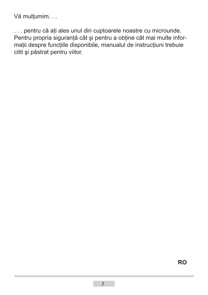 За да избегнете повреди и за да се запознаете с обслужването и функционирането на микровълновата печка, моля внимателно прочетете тази инструкция за употреба преди да монтирате и пуснете печката в действие. Vă mulţumim. . . . . . pentru că aţi ales unul din cuptoarele noastre cu microunde. Pentru propria siguranţă cât şi pentru a obţine cât mai multe informaţii despre funcţiile disponibile, manualul de instrucţiuni trebuie citit şi păstrat pentru viitor.