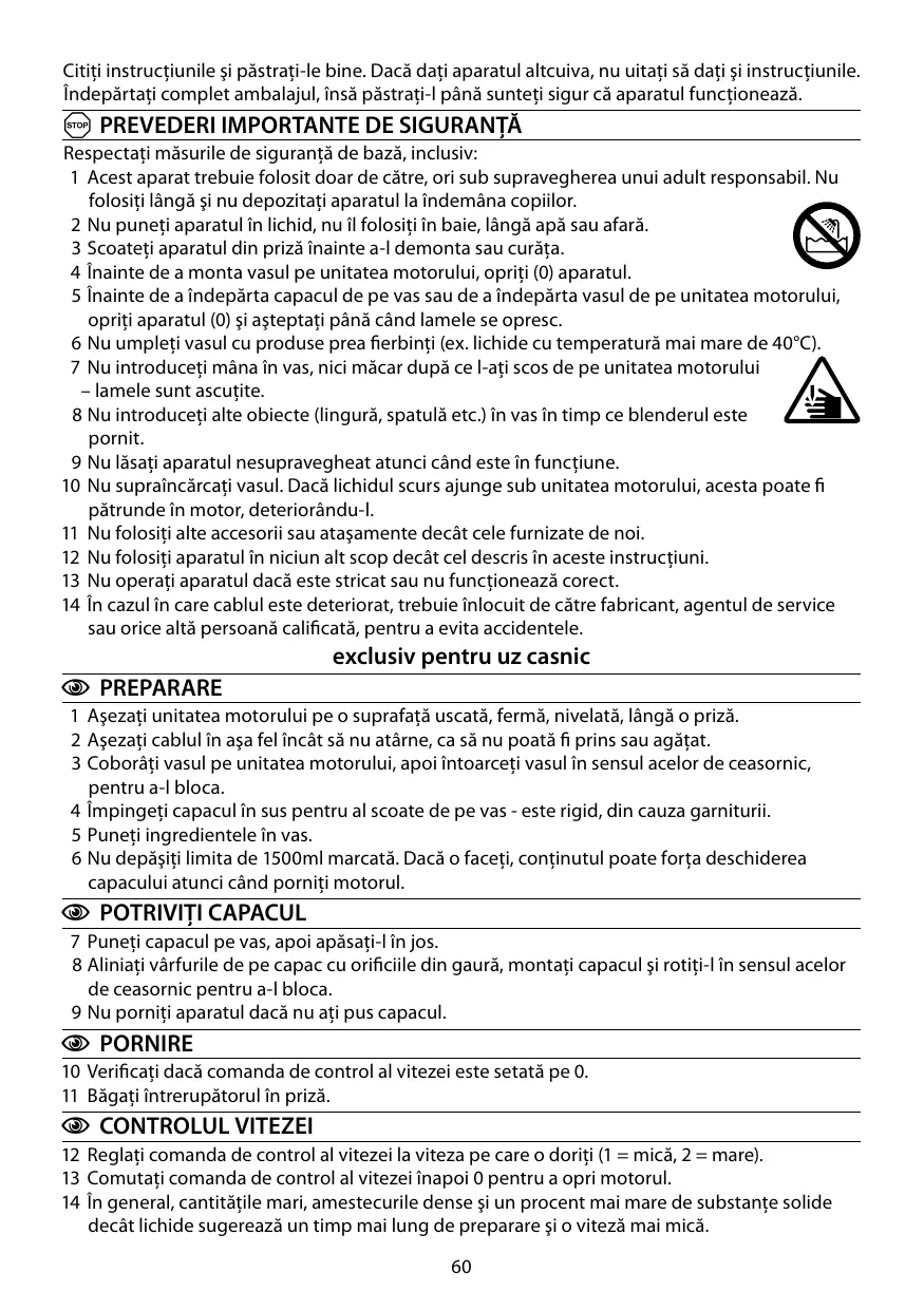 A PREVEDERI IMPORTANTE DE SIGURANŢĂ Respectaţi măsurile de siguranţă de bază, inclusiv: 1 Acest aparat trebuie folosit doar de către, ori sub supravegherea unui adult responsabil. Nu folosiţi lângă şi nu depozitaţi aparatul la îndemâna copiilor. 2 Nu puneţi aparatul în lichid, nu îl folosiţi în baie, lângă apă sau afară. 3 Scoateţi aparatul din priză înainte a-l demonta sau curăţa. 4 Înainte de a monta vasul pe unitatea motorului, opriţi (0) aparatul. 5 Înainte de a îndepărta capacul de pe vas sau de a îndepărta vasul de pe unitatea motorului, opriţi aparatul (0) şi aşteptaţi până când lamele se opresc. 6 Nu umpleţi vasul cu produse prea fierbinţi (ex. lichide cu temperatură mai mare de 40°C). 7 Nu introduceţi mâna în vas, nici măcar după ce l-aţi scos de pe unitatea motorului – lamele sunt ascuţite. 8 Nu introduceţi alte obiecte (lingură, spatulă etc.) în vas în timp ce blenderul este pornit. 9 Nu lăsaţi aparatul nesupravegheat atunci când este în funcţiune. 10 Nu supraîncărcaţi vasul. Dacă lichidul scurs ajunge sub unitatea motorului, acesta poate fi pătrunde în motor, deteriorându-l. 11 Nu folosiţi alte accesorii sau ataşamente decât cele furnizate de noi. 12 Nu folosiţi aparatul în niciun alt scop decât cel descris în aceste instrucţiuni. 13 Nu operaţi aparatul dacă este stricat sau nu funcţionează corect. 14 În cazul în care cablul este deteriorat, trebuie înlocuit de către fabricant, agentul de service sau orice altă persoană calificată, pentru a evita accidentele.