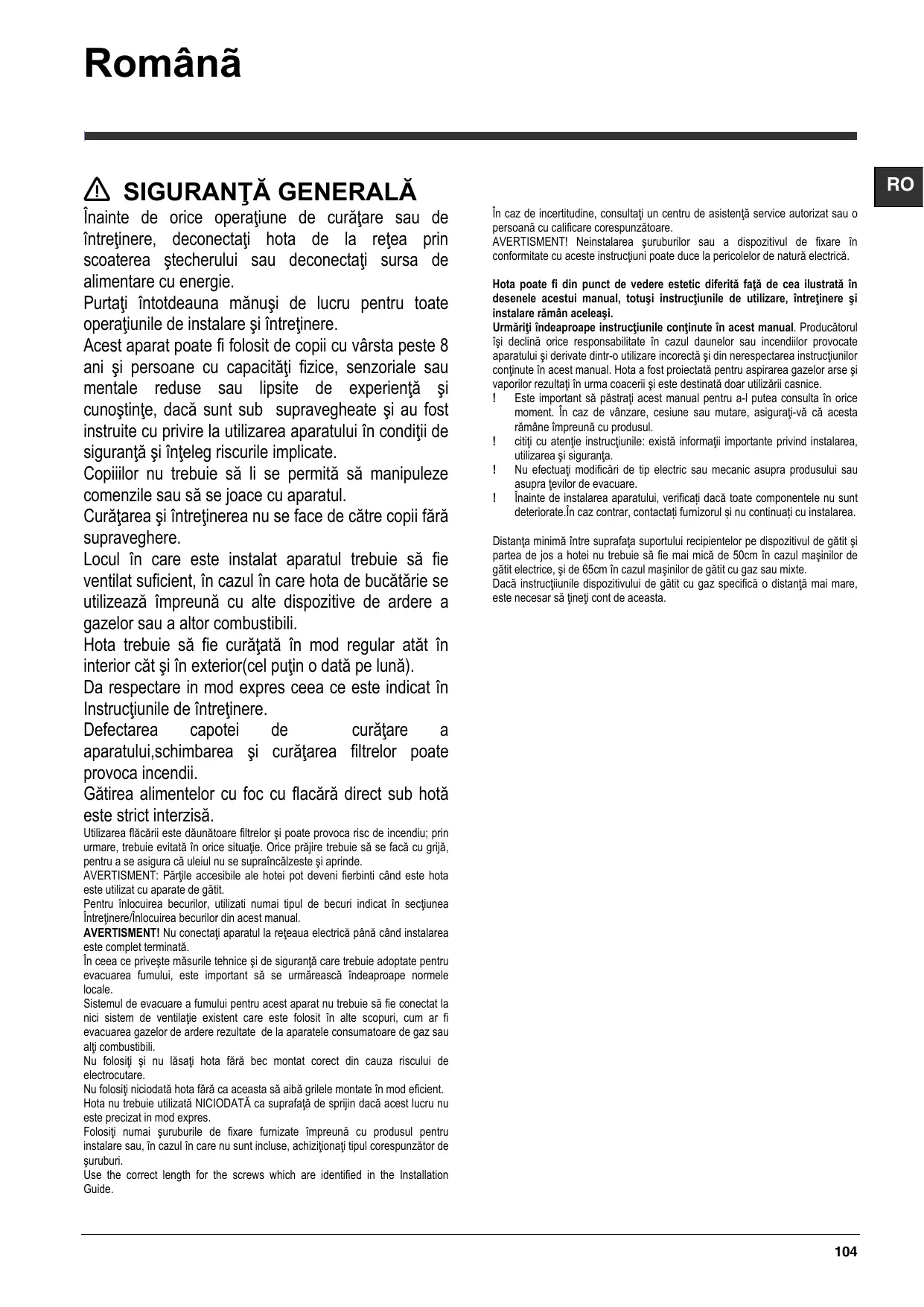 La pièce doit avoir une aération suffisante lorsque la hotte est utilisée conjointement avec d'autres appareils fonctionnant au gaz ou autres combustibles. La hotte doit être régulièrement nettoyée à la fois à l'intérieur et à l'extérieur (AU MOINS UNE FOIS PAR MOIS); cela devrait se faire en conformité avec les instructions d'entretien. Le non respect des instructions expressément fournies concernant le nettoyage de la hotte et des filtres peut provoquer des risques d'incendie. Ne pas flamber d’aliments sous la hotte.