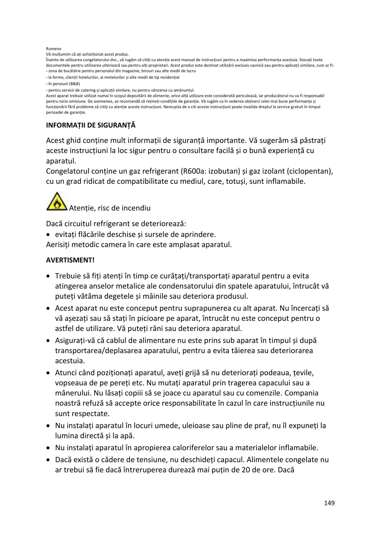 Acest ghid conține mult informații de siguranță importante. Vă sugerăm să păstrați aceste instrucțiuni la loc sigur pentru o consultare facilă și o bună experiență cu aparatul. Congelatorul conține un gaz refrigerant (R600a: izobutan) și gaz izolant (ciclopentan), cu un grad ridicat de compatibilitate cu mediul, care, totuși, sunt inflamabile. Atenție, risc de incendiu Dacă circuitul refrigerant se deteriorează: