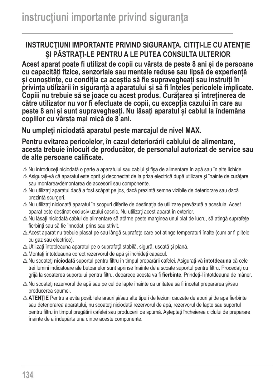 Ne dépassez pas la marque MAX. Si le cordon d’alimentation est endommagé, il doit être remplacé par le fabricant, son représentant agréé ou toute autre personne qualifiée afin d’éviter tout danger. !!Ne plongez pas, même partiellement, l’appareil ou son cordon dans du liquide. !!Assurez-vous que l’appareil est arrêté et débranché après utilisation et avant son nettoyage, ou encore pour monter/retirer un accessoire ou des pièces. !!N’utilisez pas l’appareil s’il a subi un choc, ou en cas de signes visibles de dommages ou en cas de fuite. !!N’utilisez ce produit qu’aux fins pour lesquelles il est prévu. Cet appareil est conçu exclusivement pour une utilisation domestique. N’utilisez pas cet appareil à l’extérieur. !!Ne laissez pas le cordon d’alimentation pendre dans le vide, toucher des surfaces chaudes ou s’emmêler, se bloquer ou se pincer. !!Cet appareil ne doit pas être placé sur ou près de surfaces potentiellement chaudes (telles que des plaques de cuisson au gaz ou à l’électricité). !!Utilisez toujours l’appareil sur une surface stable, sûre, sèche et horizontale. !!Replacez toujours le réservoir d’eau correctement et fermez le couvercle. !!N’enlevez jamais le porte filtre lorsque le café est en cours d’infusion. Assurez-vous toujours que les voyants des trois boutons sont allumés avant d’enlever le porte filtre. Manipulez le porte filtre avec précautions, car il peut être brûlant. Tenez-le toujours par sa poignée. !!Ne retirez pas le réservoir d’eau ou de lait tant pendant les opérations d’infusion et/ou de formation de mousse. !!ATTENTION Afin d’éviter les brûlures, les ébouillantages et/ou autres blessures résultant du contact avec de la vapeur et de l’eau chaude, ou pour ne pas endommager l’appareil, n’enlevez sous aucun prétexte le réservoir à eau ou lait, ou le porte filtre pendant une opération d’infusion ou de formation de mousse. Attendez la fin du cycle d’infusion avant de retirer ces pièces.