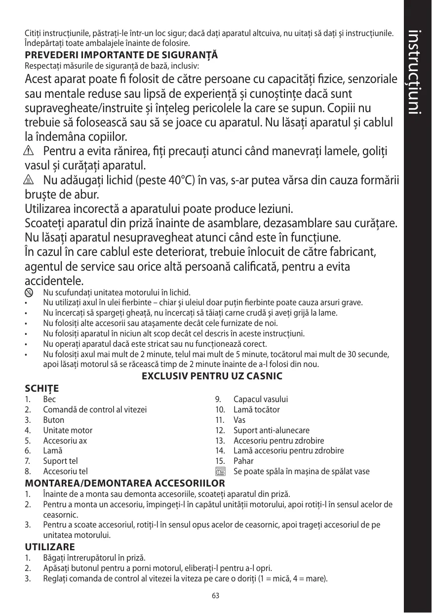 • N’essayez pas de piler de la glace ou de hacher de la viande crue et faites attention aux lames. N’adaptez pas d’accessoires autres que ceux fournis. N’utilisez pas l’appareil à d’autres fins que celles décrites dans ce mode d’emploi. N’utilisez pas l’appareil s’il est endommagé ou s’il ne fonctionne pas correctement. Ne pas utiliser le batteur pendant plus de 2 minutes, le fouet pendant plus de 5 minutes, le hachoir pendant plus de 30 secondes. Laissez le moteur refroidir pendant 2 minutes avant d’utiliser à nouveau ces accessoires.