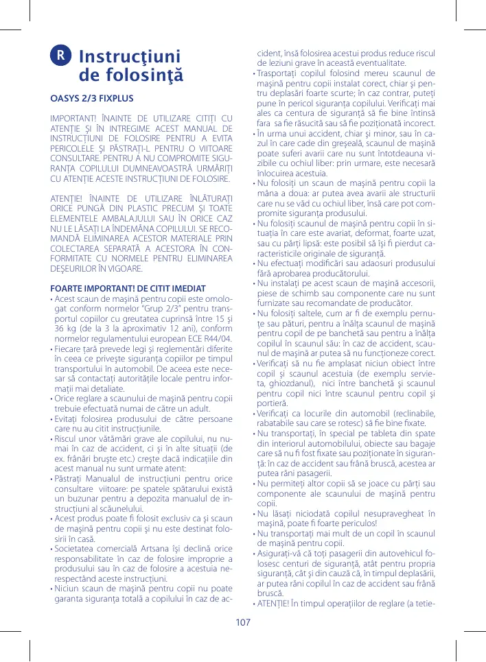 LIRE ATTENTIVEMENT ET ENTIÈREMENT CETTE NOTICE POUR ÉVITER TOUT DANGER ET LA CONSERVER POUR TOUTE RÉFÉRENCE FUTURE. POUR NE PAS COMPROMETTRE LA SÉCURITÉ DE VOTRE ENFANT, SUIVEZ ATTENTIVEMENT CES INSTRUCTIONS. ATTENTION ! AVANT D’UTILISER LE PRODUIT, ÔTER ET ÉLIMINER TOUS LES SACHETS EN PLASTIQUE ÉVENTUELS ET TOUS LES ÉLÉMENTS COMPOSANT L’EMBALLAGE DU PRODUIT ET LES TENIR HORS DE PORTÉE DES ENFANTS. IL EST CONSEILLÉ D’ÉLIMINER CES ÉLÉMENTS EN FAISANT LE TRI SÉLECTIF CONFORMÉMENT AUX LOIS EN VIGUEUR. TRÈS IMPORTANT ! À LIRE IMMÉDIATEMENT • Ce siège-auto est homologué “Groupe 2/3”, pour le transport d’enfants de 15 à 36 Kg (de 3 à 12 ans de façon indicative), conformément au règlement européen ECE R 44/04. • Chaque pays applique des lois et des règlements différents en matière de sécurité pour le transport des enfants en voiture. C’est pourquoi il est conseillé de contacter les autorités locales pour obtenir davantage d’informations. • Les activités de réglage du siège-auto doivent être effectuées exclusivement par un adulte. • Éviter que quiconque utilise le produit sans avoir lu la notice. • Le risque de blessures de l’enfant, non seulement en cas d’accident mais aussi dans d’autres circonstances (par ex. freinages brusques, etc.) augmente si les indications de cette notice ne sont pas suivies scrupuleusement. • Conserver la Notice pour toute référence future : une poche permettant de ranger la notice se trouve derrière le dossier du siège auto. • Le produit doit être utilisé exclusivement comme siège-auto et ne doit pas être utilisé à la maison. • La société Artsana décline toute responsabilité en cas d’utilisation incorrecte du produit et pour toute utilisation différente de cette notice. • Aucun siège-auto ne peut garantir la sécurité totale de l’enfant en cas d’accident, mais son utilisation réduit le risque de blessures graves. • Transporter un enfant dans un siège-auto correctement installé, même lors de trajets brefs ; dans le cas contraire, cela pourrait nuire à sa sécurité. Vérifier notamment que la ceinture est correcte-