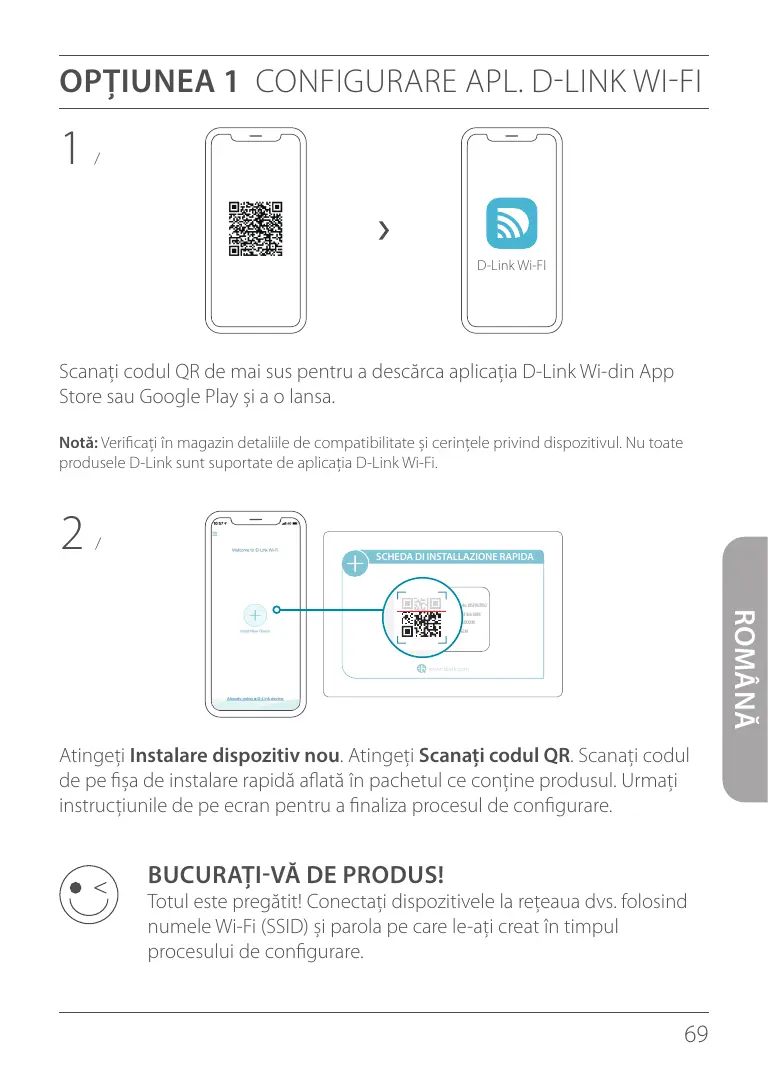 ROMÂNĂ Nome modello: DISPOSITIVO Nome Wi-Fi: d-link-XXXX Password: XXXXXXXX S/N: 123456789 www.dlink.com Atingeți Instalare dispozitiv nou. Atingeți Scanați codul QR. Scanați codul de pe fișa de instalare rapidă aflată în pachetul ce conține produsul.Urmați instrucțiunile de pe ecran pentru a finaliza procesul de configurare. BUCURAȚI-VĂ DE PRODUS! Totul este pregătit! Conectați dispozitivele la rețeaua dvs. folosind numele Wi-Fi (SSID) și parola pe care le-ați creat în timpul procesului de configurare.