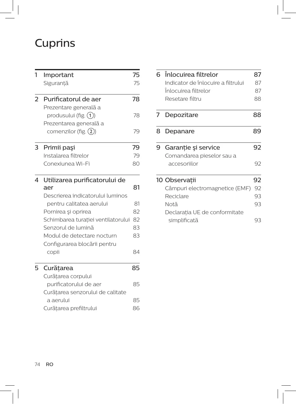 Apasă butonul pentru turaţia pentru a selecta ventilatorului modul turbo (t) (fig. n). Senzorul de lumină Cu senzorul de lumină, funcţionarea purificatorului de aer se poate adapta luminii ambiante. Atunci când lumina ambiantă scade în intensitate timp de 10 secunde, toate indicatoarele luminoase de pe panoul de control se vor stinge treptat. În timpul acestei perioade, poţi apăsa orice buton şi toate indicatoarele luminoase se vor aprinde din nou. Dacă nu efectuezi alte operaţi în interval de 10 secunde, toate indicatoarele luminoase se vor stinge. După ce lumina ambiantă devine intensă şi se menţine cel puţin 10 secunde, toate indicatoarele luminoase se vor aprinde din nou. Modul de detectare nocturn Poţi activa modul de detectare pe timp de noapte prin două metode. Activarea manuală a modului de detectare pe timp de noapte