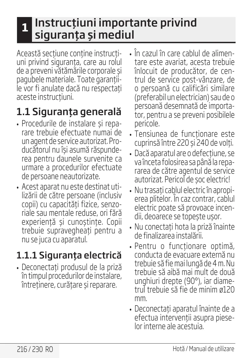 - Asigurați-vă că mediuș este ventilat cu aer curat în timpul funcționării hotei, în special în cazul masinilor de gătit pe gaz.