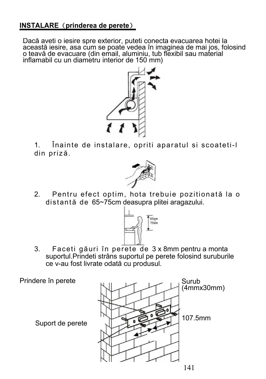Acest manual este conceput pentru a va oferi toate instructiunile necessities referitoare la instalarea, Utilizarea si intretnerea aparatului. Pentru a opera unitatea corect si in siguranta, va rugam sa cititi acest manual cu instruciuni cu atentie inainte de instalare si utilizare. Hota de aragaz a fost realizata folosind materiale de inaltă calitate si are un design aerodinamic. Echipata cu un motor electric de mare putere si un ventilator centrifugal, aceasta ofera putere mare de aspirare, functionare cu zgomot redus, filtru pentru grasime si instalare si asamblare usoară.