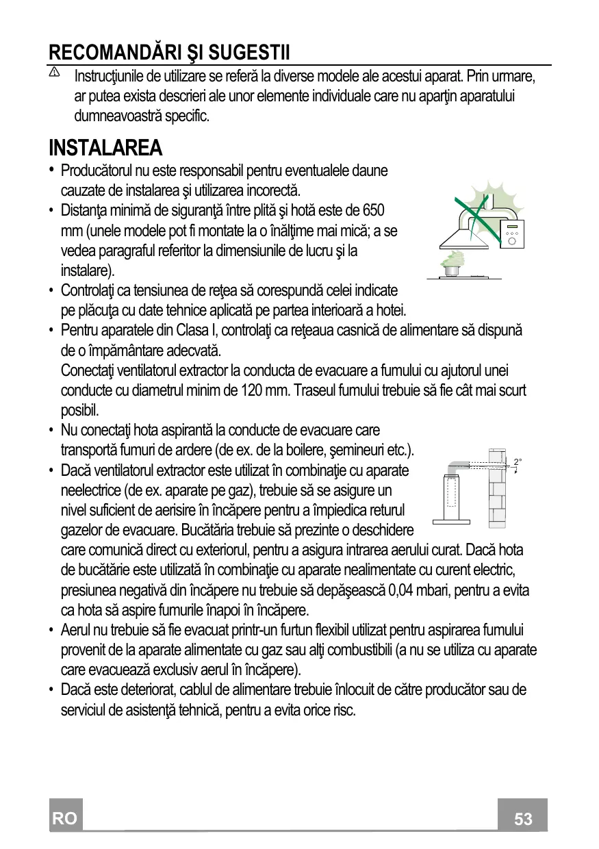 - Dacă ventilatorul extractor este utilizat în combinaţie cu aparate neelectrice (de ex. aparate pe gaz), trebuie să se asigure un nivel suficient de aerisire în încăpere pentru a împiedica returul gazelor de evacuare. Bucătăria trebuie să prezinte o deschidere care comunică direct cu exteriorul, pentru a asigura intrarea aerului curat. Dacă hota de bucătărie este utilizată în combinaţie cu aparate nealimentate cu curent electric, presiunea negativă din încăpere nu trebuie să depăşească 0,04 mbari, pentru a evita ca hota să aspire fumurile înapoi în încăpere.