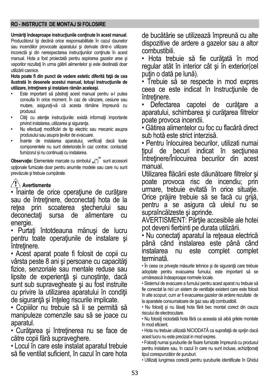 • L’air ne doit pas être envoyé dans un conduit utilisé pour évacuer les fumées d’appareils utilisant du gaz ou un autre combustible. • Ne pas utiliser ou laisser la hotte sans les lampes correctement montées, car un éventuel risque de choc électrique est possible. • N’utilisez jamais la hotte sans la grille montée correctement! • La hotte ne doit JAMAIS être utilisée comme une surface d'appui, sauf indication expresse.