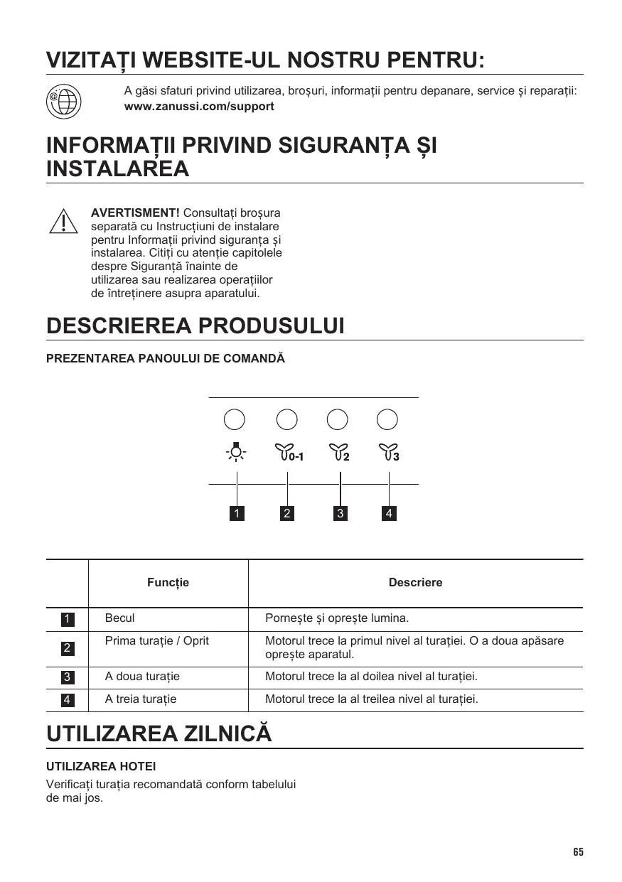 VIZITAȚI WEBSITE-UL NOSTRU PENTRU: A găsi sfaturi privind utilizarea, broșuri, informații pentru depanare, service și reparații: www.zanussi.com/support