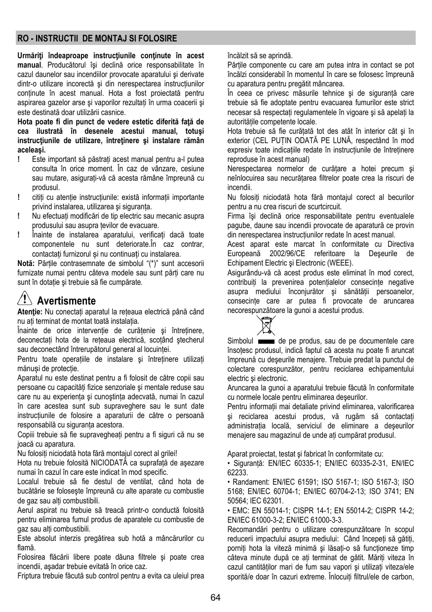 Urmarii indeaprope instructiunile continne in acest manual. Producatorul işi declina orice responsabilitate in cazul dauneler Sau incendiilor provocate aparatului si derivate dintr-o utilizare incorcetă si din nerespectarea instructiunilor continne in acest manual. Hota a fost proiectata pentru aspirarea gazeler arse si vaporilor rezultati in urma coacerii si este destinata doar Utilizarii casnice.