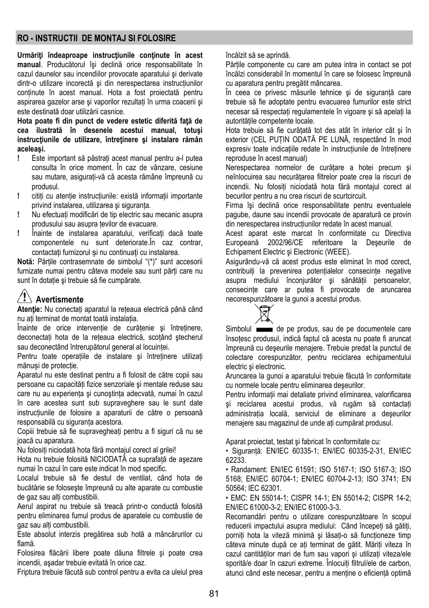 Urmarii indeaprope instructiunile continne in acest manual. Producatorul işi declina orice responsabilitate in cazul dauneler Sau incendiilor provocate aparatului si derivate dintr-o utilizare incorcetă si din nerespectarea instructiunilor continne in acest manual. Hota a fost proiectata pentru aspirarea gazeler arse si vaporilor rezultati in urma coacerii si este destinata doar Utilizarii casnice.