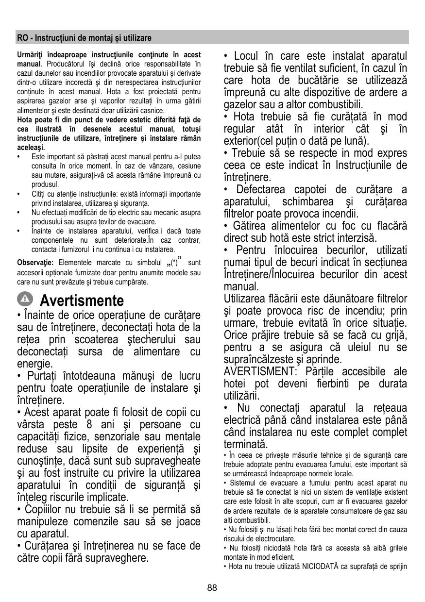 La hotte peut avoir des configurations esthétiques différentes par rapport à ce qui est illustré dans les dessins de ce manuel, cependant les instructions pour l’utilisation, l’entretien et l’installation restent identiques. • Il est important de conserver ce livret pour pouvoir le consulter à tout moment. En cas de vente, de cession ou de déménagement, assurez-vous que la notice d'utilisation l'accompagne. • Veuillez lire attentivement les instructions, vous trouverez des informations importantes sur l'installation, le mode d'emploi et la sécurité. • Ne pas effectuer des modifications électriques ou mécaniques sur le produit ou sur les conduits d’évacuation. • Avant d'installer l'appareil, vérifiez qu’il n’y a aucun composant endommagé. Sinon, contactez votre revendeur et ne continuez pas l'installation. Remarque : Les pièces portant le symbole "(*)" sont des accessoires optionnels fournis uniquement avec certains modèles ou des pièces non fournies, à acheter.
