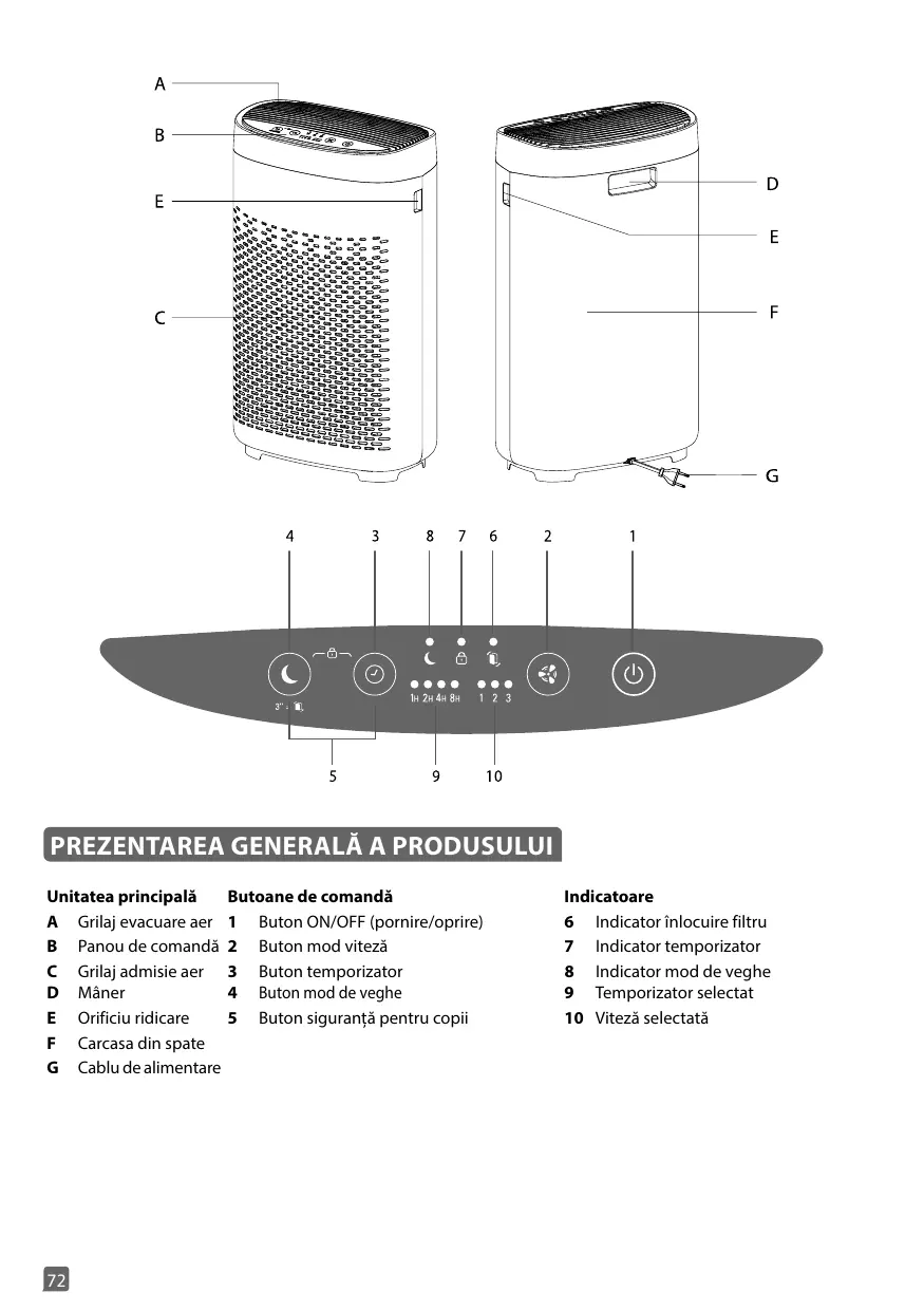 6 Indicateur de remplacement de filtre 7 Indicateur du minuteur 8 Indicateur de mode veille 9 Minuteur sélectionné 10 Vitesse sélectionnée • Pour votre sécurité, cet appareil est conforme aux normes et réglementations en vigueur (basse tension, compatibilité électromagnétique, directives environnementales, etc.). • Cet appareil ne doit pas être utilisé par des personnes (y compris les enfants) ayant des capacités physiques, sensorielles ou mentales réduites, ou un manque d'expérience et de connaissances, à moins qu'elles ne soient encadrées ou qu'elles n'aient reçu au préalable des instructions quant à son utilisation par une personne responsable de leur sécurité. • Les enfants doivent être surveillés pour s’assurer qu’ils ne jouent pas avec l’appareil. • L'appareil peut être utilisé par des enfants âgés de 8 ans et plus et des personnes manquant d'expérience ou de connaissances ou ayant des capacités physiques, sensorielles ou mentales réduites, à condition qu'elles soient encadrées, qu'elles aient appris à utiliser l'appareil en toute sécurité et qu'elles soient conscientes des risques encourus. Les enfants ne doivent pas jouer avec l’appareil. • Si le câble d’alimentation est endommagé, il doit être remplacé par le fabricant, son service après-vente ou des personnes de qualification similaire afin d’éviter tout danger. • Les enfants ne doivent pas nettoyer l'appareil ni effectuer d'entretien sans être surveillés. • Pour les opérations d'entretien, veuillez consulter la section « Entretien ». • Conservez l’appareil et son câble d’alimentation hors de portée des enfants âgés de moins de 8 ans. 10