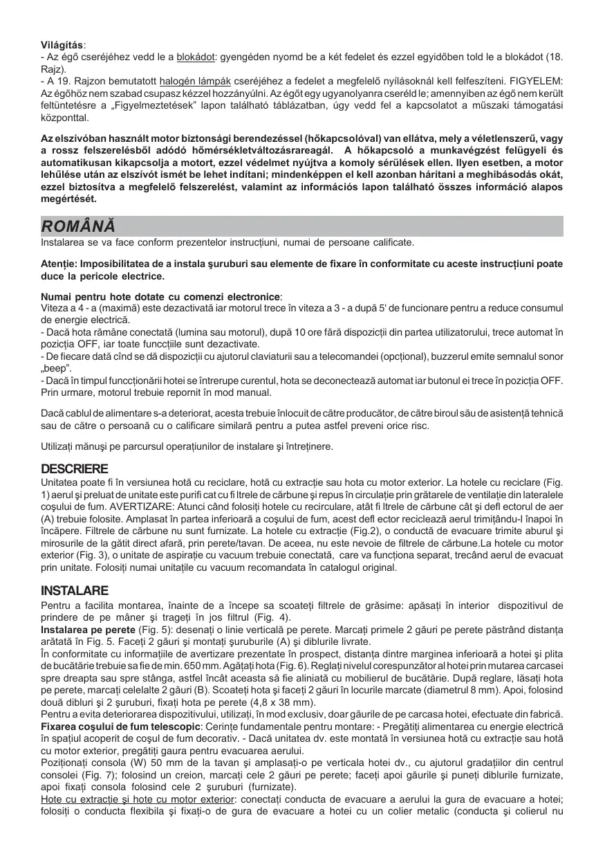 Motorul folosit la această hotă are un dispositiv de siguranta (siguranta termica) sensibil la modifi cari de temperatura; accidental sau din cauza unor erori de montare, aest dispositiv se poate declansași poate opri automat motorul, prevenind astfel deteriorarea gravă a aparatului. In asemenea cazuri, după ce aihasat motorul sα se raceasca, hota poate fi pornita din nou; cauza functionarii defectuoase trebuie eliminata, asigurändu-va ca hota a fost corect montatași加密 toate instrutiunile din foia de informatiui au fost respectate.