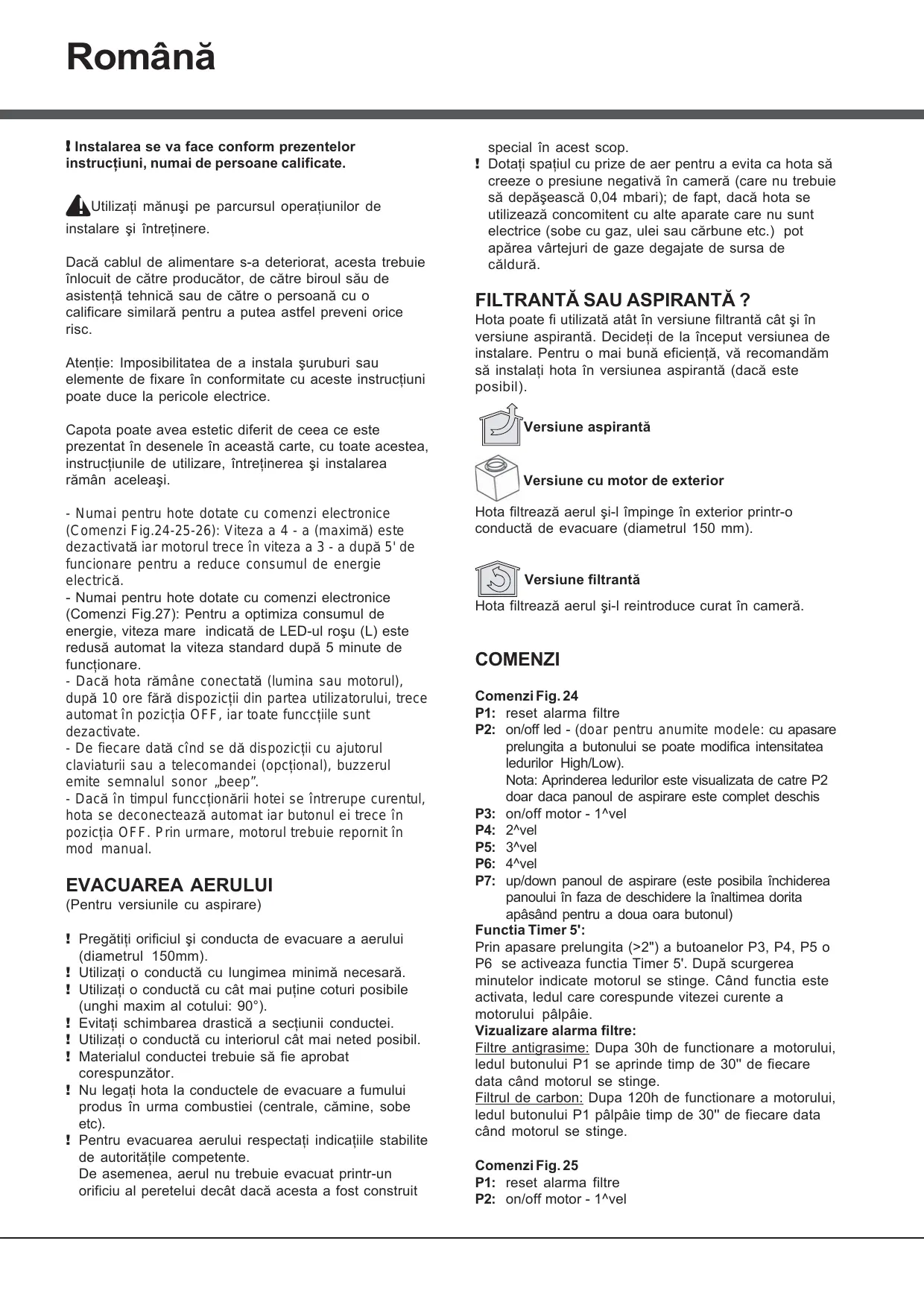 Capota poate avea estetic diferit de ceea ce este prezentat in desenele in această carte, cu toate acestea, instructiunile deutilizare, intreținerea si instalarea rămân aceleasi.