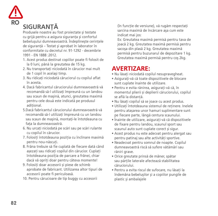 Siguranţă Produsele noastre au fost proiectate şi testate cu grijă pentru a asigura siguranţa şi confortul bebeluşului dumneavoastră. Îndeplineşte cerinţele de siguranţă – Testat şi aprobat în laborator în conformitate cu decretul nr. 91-1292 - decembrie 1991 - EN 1888 :2012.