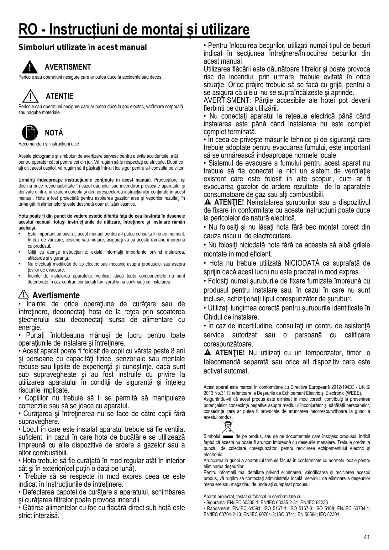 NOTĂ Recomandări și instrucțiuni utile Aceste pictograme şi simboluri de avertizare servesc pentru a evita accidentele, atât pentru operator cât și pentru cei din jur. Vă rugăm să le respectați cu strictețe. După ce ați citit acest capitol, vă rugăm să îl păstraţi într-un loc sigur pentru a-l consulta pe viitor. Urmăriţi îndeaproape instrucţiunile conţinute în acest manual. Producătorul îşi declină orice responsabilitate în cazul daunelor sau incendiilor provocate aparatului şi derivate dintr-o utilizare incorectă şi din nerespectarea instrucţiunilor conţinute în acest manual. Hota a fost proiectată pentru aspirarea gazelor arse şi vaporilor rezultaţi în urma gătirii alimentelor şi este destinată doar utilizării casnice. Hota poate fi din punct de vedere estetic diferită faţă de cea ilustrată în desenele acestui manual, totuşi instrucţiunile de utilizare, întreţinere şi instalare rămân aceleaşi. • Este important să păstraţi acest manual pentru a-l putea consulta în orice moment. În caz de vânzare, cesiune sau mutare, asiguraţi-vă că acesta rămâne împreună cu produsul. • Citiţi cu atenţie instrucţiunile: există informaţii importante privind instalarea, utilizarea şi siguranţa. • Nu efectuaţi modificări de tip electric sau mecanic asupra produsului sau asupra ţevilor de evacuare. • Înainte de instalarea aparatului, verificați dacă toate componentele nu sunt deteriorate.În caz contrar, contactați furnizorul și nu continuați cu instalarea.