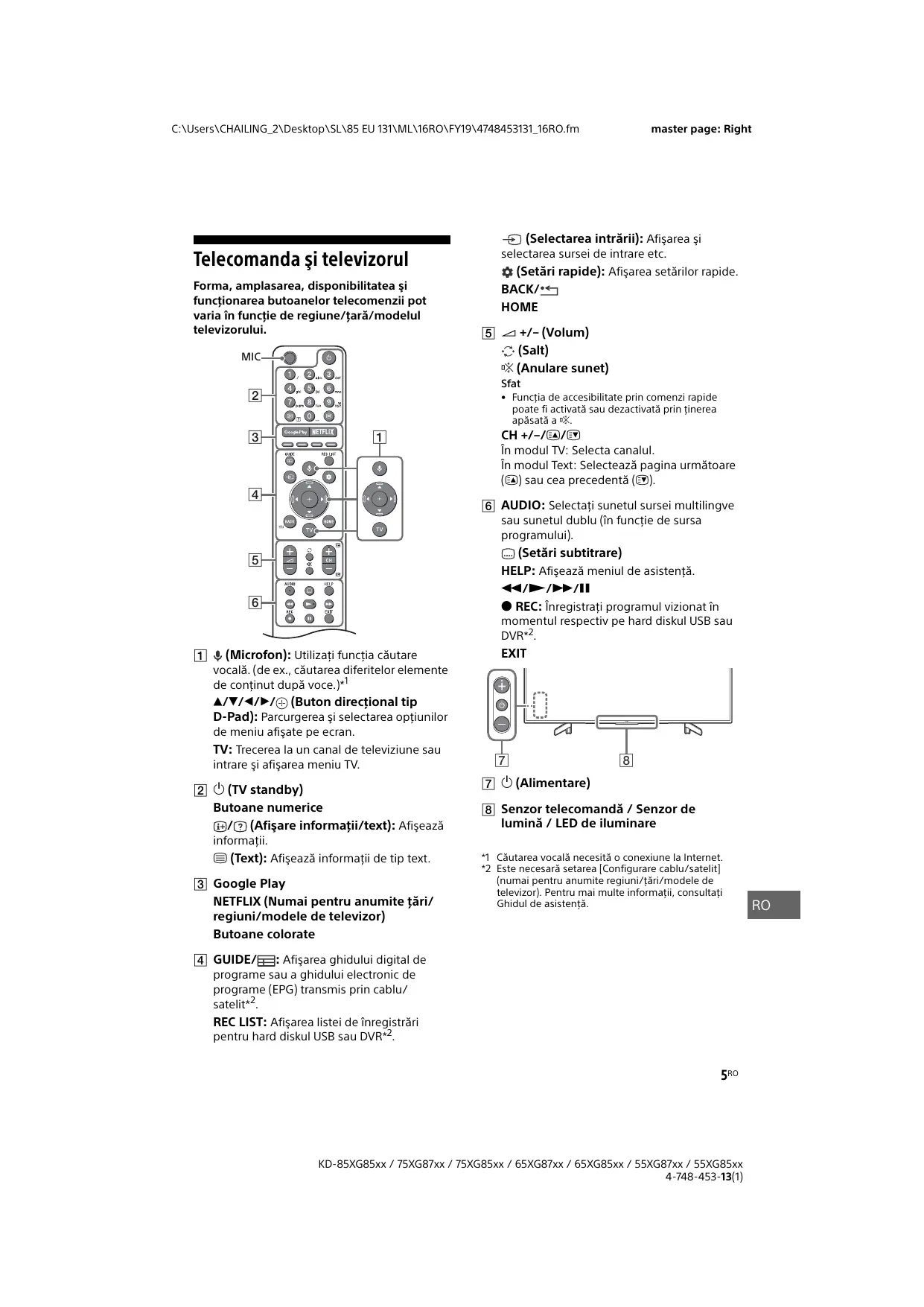 (Alimentare) (TV standby) Butoane numerice / (Afişare informaţii/text): Afişează Senzor telecomandă / Senzor de lumină / LED de iluminare informaţii. (Text): Afişează informaţii de tip text. Google Play NETFLIX (Numai pentru anumite ţări/ regiuni/modele de televizor) Butoane colorate *1 Căutarea vocală necesită o conexiune la Internet. *2 Este necesară setarea [Configurare cablu/satelit] (numai pentru anumite regiuni/ţări/modele de televizor). Pentru mai multe informaţii, consultaţi Ghidul de asistenţă. GUIDE/ : Afişarea ghidului digital de programe sau a ghidului electronic de programe (EPG) transmis prin cablu/ satelit*2. REC LIST: Afişarea listei de înregistrări pentru hard diskul USB sau DVR*2. 5RO KD-85XG85xx / 75XG87xx / 75XG85xx / 65XG87xx / 65XG85xx / 55XG87xx / 55XG85xx 4-748-453-13(1)