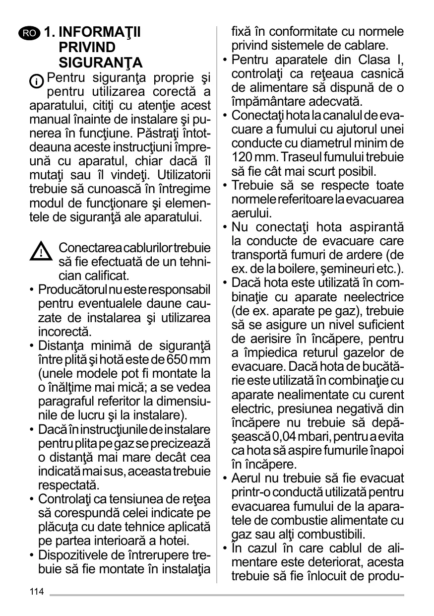 Funciona con la puerta cerrada y abierta con motor + luces = Off. Presión de 4 segundos = habilita/deshabilita el Bloqueo del teclado. Funciona sólo con la puerta abierta. Presión breve = activa/desactiva la primera velocidad. La alarma entra en función después de 200 horas de trabajo efectivo de la campana. Tecla led C+G fijo. Tecla led C intermitente Tecla led G fijo. à terra. • Ligue o aspirador à chaminé utilizando um tubo de, pelo menos, 120 mm de diâmetro. O caminho percorrido pelo fumo deve ser o mais curto possível. • Devem ser respeitadas todas as disposições da legislação em matéria de evacuação de ar. • Não ligue o exaustor a condutas de fumo que transportem fumos de combustão (por ex. caldeiras, lareiras, etc.). • Se o exaustor for utilizado em conjunto com aparelhos não elétricos (por ex. aparelhos alimentados a gás), deve ser tida em devida conta a necessidade de assegurar um grau suficiente de ventilação no aposento, para impedir o retorno dos gases de exaustão. Referitor la măsurile tehnice şi de siguranţă ce trebuie adoptate pentru evacuarea fumului, este important să se respecte cu stricteţe normele stabilite de autorităţile locale. AVERTIZARE: înainte de a instala hota, îndepărtați peliculele de protecție. Utilizaţi numai şuruburi şi elemente de prindere de tip corespunzător pentru hotă. AVERTIZARE: lipsa instalării şuruburilor sau a dispozitivelor de fixare în conformitate cu aceste instrucţiuni poate cauza riscuri de şoc electric. Nu vă uitaţi direct prin instrumente optice (binoclu, lupă….). Nu pregătiţi preparate flambate sub hotă: ar putea surveni un incendiu. Acest aparat poate fi folosit de copii cu vârsta de cel puţin 8 ani SI