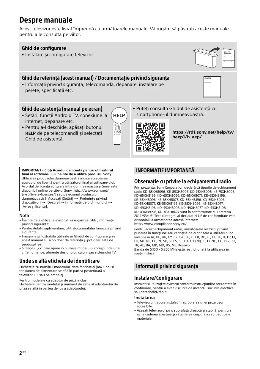 Observaţie cu privire la echipamentul radio Prin prezenta, Sony Corporation declară că tipurile de echipament radio KD-85XH8096, KE-85XH8096, KD-75XH8096, KE-75XH8096, KD-65XH8196, KD-65XH8096, KD-65XH8077, KE-65XH8196, KE-65XH8096, KE-65XH8077, KD-55XH8196, KD-55XH8096, KD-55XH8077, KE-55XH8196, KE-55XH8096, KE-55XH8077, KD-49XH8196, KD-49XH8096, KD-49XH8077, KD-43XH8196, KD-43XH8096, KD-43XH8077 sunt în conformitate cu Directiva 2014/53/UE. Textul integral al declarației UE de conformitate este disponibil la următoarea adresă internet: http://www.compliance.sony.eu/ Pentru acest echipament radio, următoarele restricţii privind punerea în funcţiune sau cerinţele de autorizare a utilizării sunt valabile în AT, BE, HR, CY, CZ, DK, EE, FI, FR, DE, EL, HU, IE, IT, LV, LT, LU, MT, NL, PL, PT, SK, SI, ES, SE, UK, UK (NI), IS, LI, NO, CH, BG, RO, TR, AL, BA, MK, MD, RS, ME, Kosovo : Banda de 5.150 - 5.350 MHz este restricţionată la utilizarea în spaţii închise. Unde se află eticheta de identificare Etichetele cu numărul modelului, data fabricaţiei (an/lună) și tensiunea de alimentare se află în partea posterioară a televizorului sau pe ambalaj. Pentru modelele cu adaptor de priză inclus: Etichetele pentru modelul şi numărul de serie al adaptorului de priză se află în partea de jos a adaptorului. Informaţii privind siguranţa Instalare/Configurare Instalaţi și utilizaţi televizorul conform instrucţiunilor prezentate în continuare, pentru a evita riscurile de incendii, șocurile electrice sau deteriorări/răniri. Instalarea