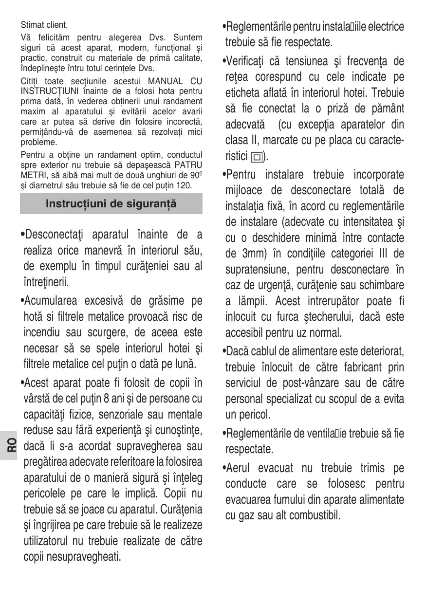 •Nous vous conseillons d’utiliser des gants et de porter une attention particulière pendant le nettoyage de l’intérieur de la hotte. •Votre hotte est destinée à un usage domestique et uniquement pour l’extraction et la purification des gaz en provenance de la préparation d’aliments. Une utilisation différente pourrait être dangereuse et vous en serez totalement responsable. Le fabricant ne répond pas en cas de dommage causé par un usage incorrect de l’appareil. •Si vous avez besoin d’une réparation, vous devrez contacter le Service d’Assistance Technique du fabricant le plus proche et n’utiliser que des rechanges originaux. •Les réparations ou modifications réalisées par un personnel non qualifié peuvent causer des dommages sur l’appareil et produire un fonctionnement incorrect, ce qui met votre propre sécurité en danger. •Cet appareil remplit la Directive Européenne 2012/19/UE applicable aux appareils électriques et électroniques, relative aux déchets d’équipements électriques et électroniques. La directive fournit le cadre général valable dans l’Union Européenne pour le retrait et la réutilisation des déchets d’appareils électriques et électroniques .