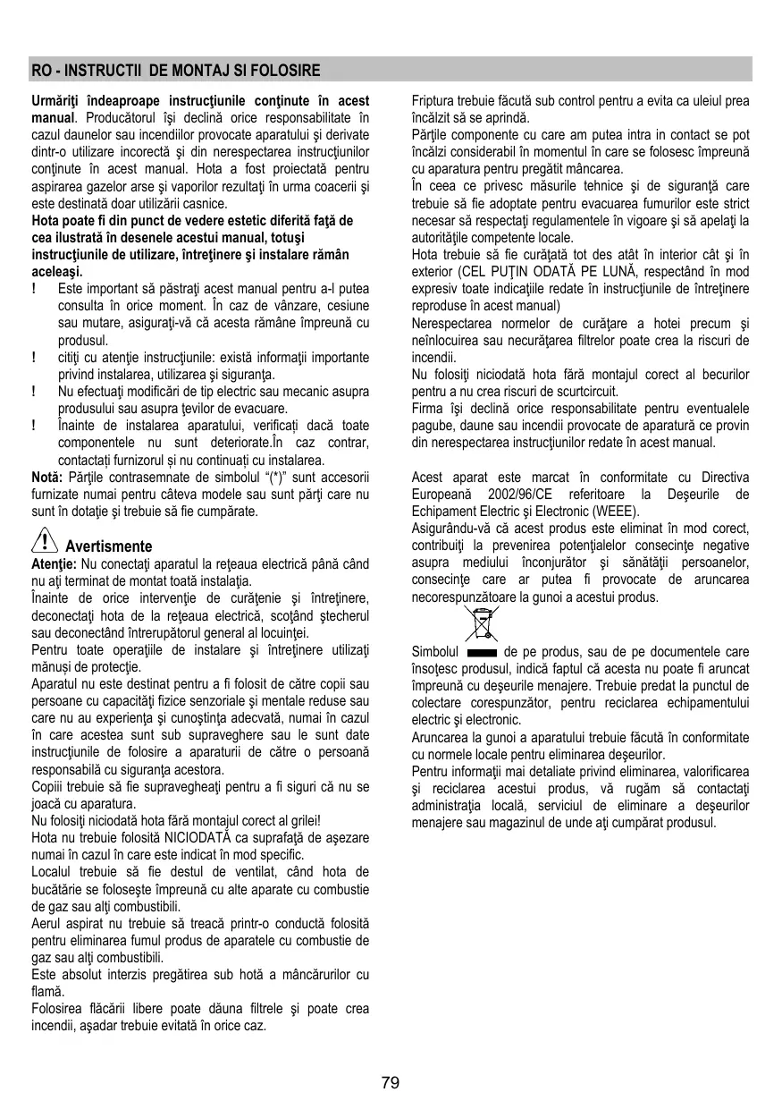 Suivre impérativement les instructions de cette notice. Le constructeur décline toute responsabilité pour tous les inconvénients, dommages ou incendies provoqués à l’appareil et dûs à la non observation des instructions de la présente notice. Cette hotte prévue pour l’aspiration des fumées et vapeurs de cuisson est destinée à un usage domestique exclusivement.