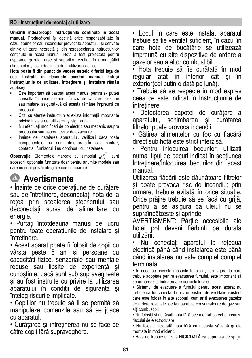 La hotte peut avoir des configurations esthétiques différentes par rapport à ce qui est illustré dans les dessins de ce manuel, cependant les instructions pour l’utilisation, l’entretien et l’installation restent identiques. • Il est important de conserver ce livret pour pouvoir le consulter à tout moment. En cas de vente, de cession ou de déménagement, assurez-vous que la notice d'utilisation l'accompagne. • Veuillez lire attentivement les instructions, vous trouverez des informations importantes sur l'installation, le mode d'emploi et la sécurité. • Ne pas effectuer des modifications électriques ou mécaniques sur le produit ou sur les conduits d’évacuation. • Avant d'installer l'appareil, vérifiez qu’il n’y a aucun composant endommagé. Sinon, contactez votre revendeur et ne continuez pas l'installation. Remarque : Les pièces portant le symbole "(*)" sont des accessoires optionnels fournis uniquement avec certains modèles ou des pièces non fournies, à acheter.