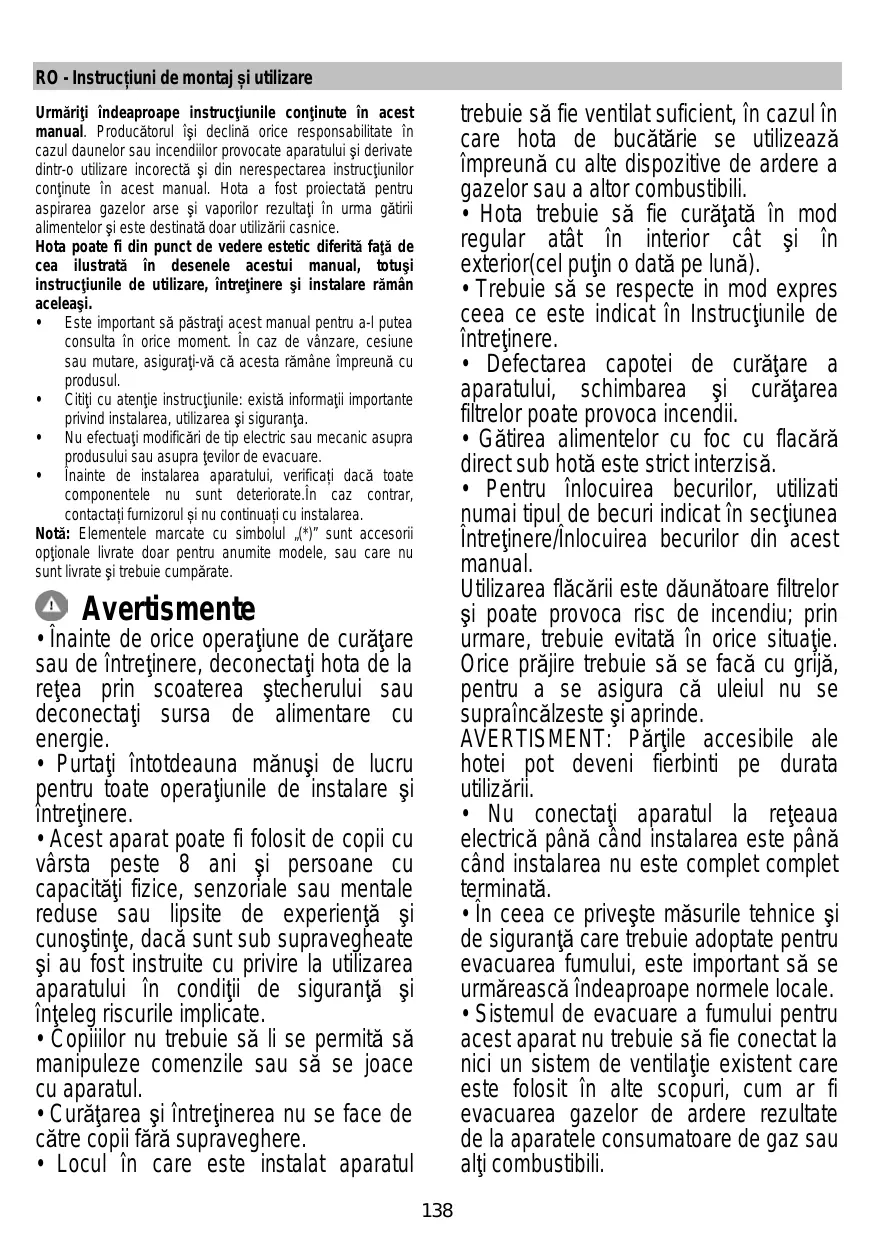 Aténgase estrictamente a las instrucciones del presente manual. Se declina cada responsabilidad por eventuales inconvenientes, daños o incendios provocados al aparato originados por la inobservancia de las instrucciones colocadas en este manual. La campana extractora ha sido ideada para la aspiración de humos y vapores producidos durante la cocción y para el uso doméstico.